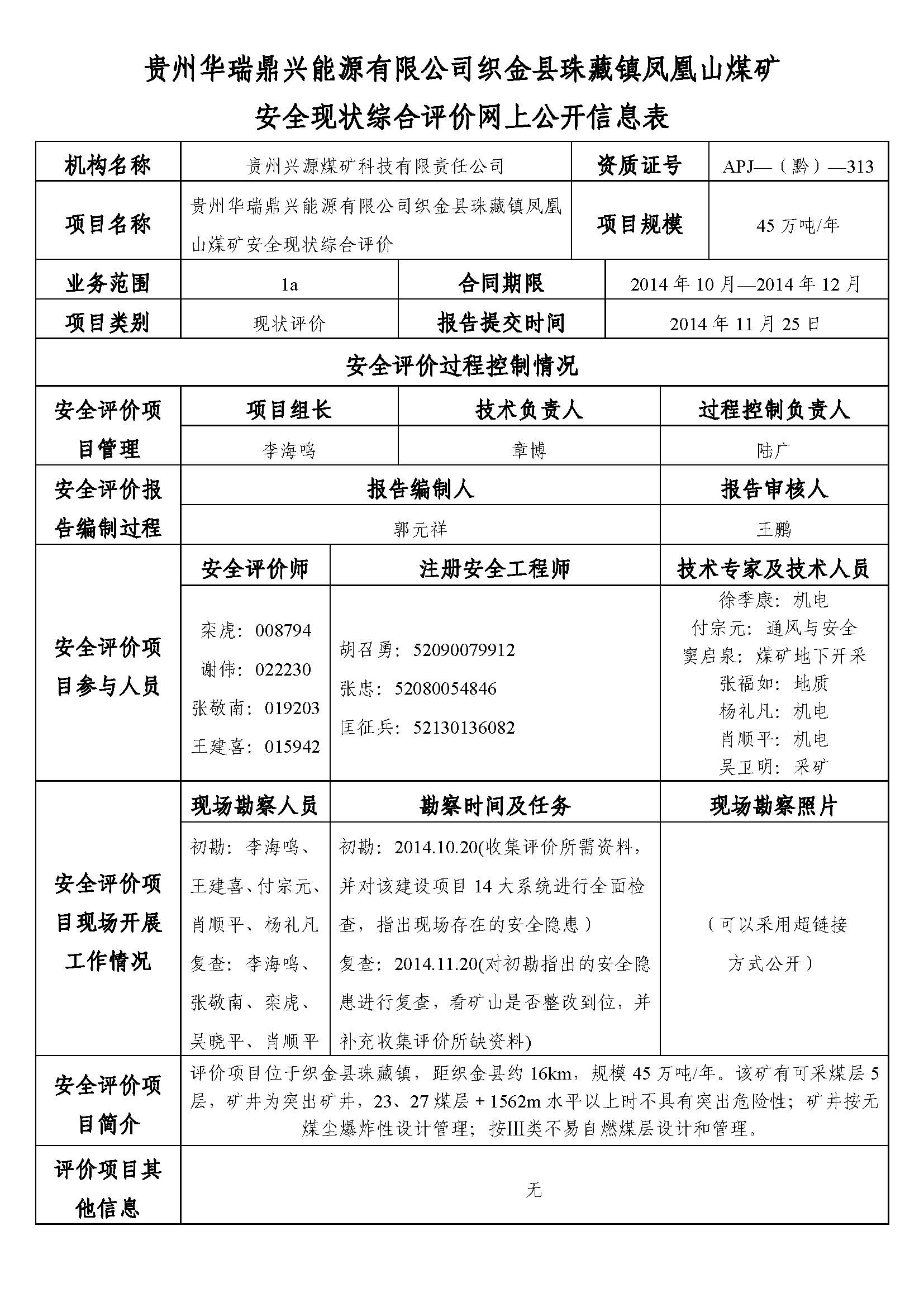 貴州華瑞鼎興能源有限公司織金縣珠藏鎮鳳凰山煤礦安全評價業務網上公開信息表