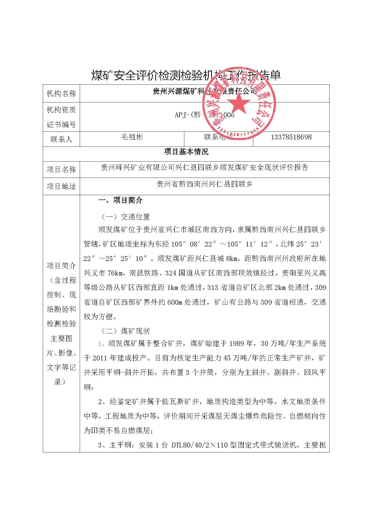 煤礦安全評(píng)價(jià)檢測(cè)檢驗(yàn)機(jī)構(gòu)工作報(bào)告單【貴州嶧興礦業(yè)有限公司興仁縣四聯(lián)鄉(xiāng)順發(fā)煤礦安全現(xiàn)狀評(píng)價(jià)報(bào)告】