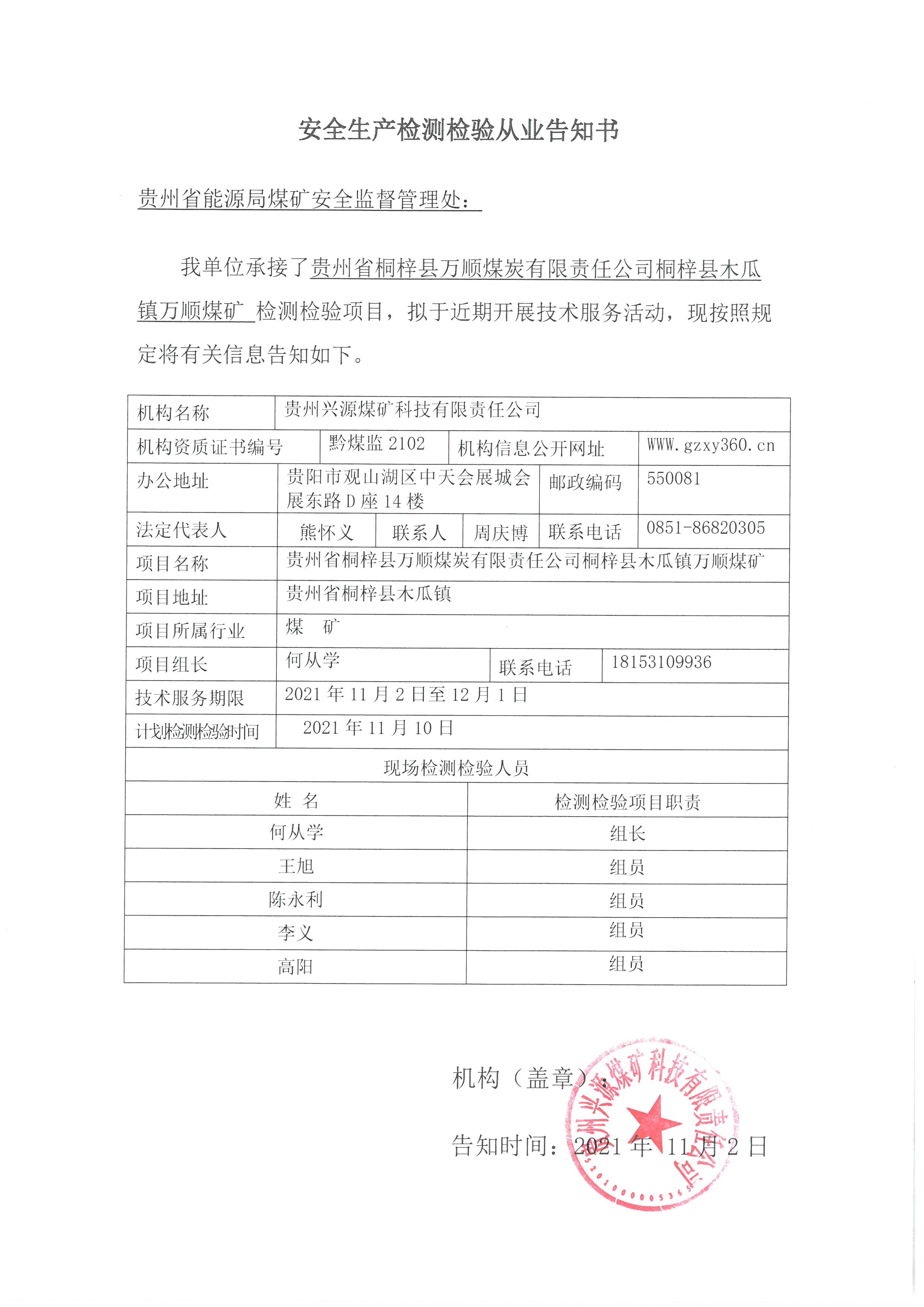 安全生產(chǎn)檢測檢驗從業(yè)告知書【貴州省桐梓縣萬順煤炭有限責任公司桐梓縣木瓜鎮(zhèn)萬順煤礦】