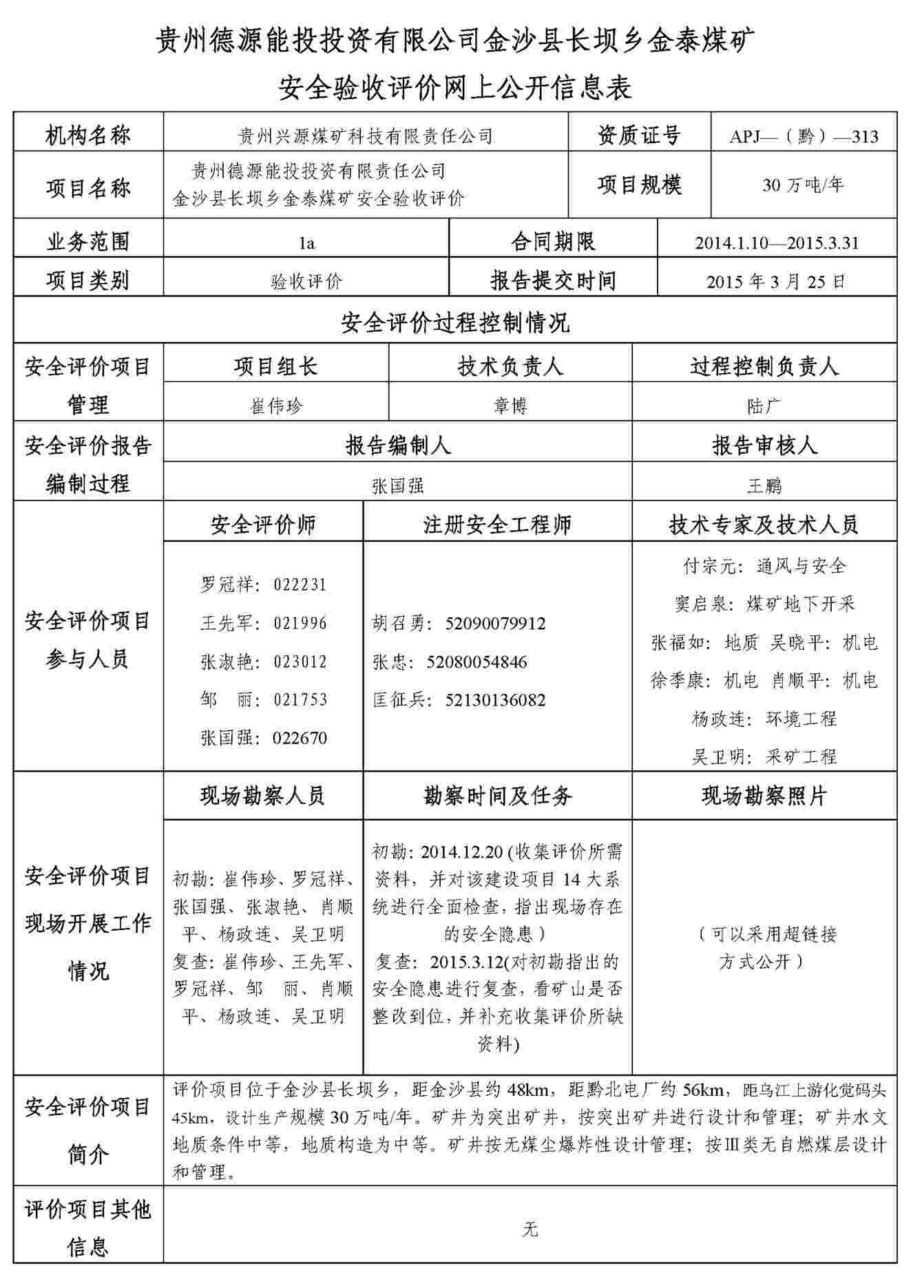 金沙縣長壩鄉(xiāng)金泰煤礦安全評價業(yè)務(wù)網(wǎng)上公開信息表