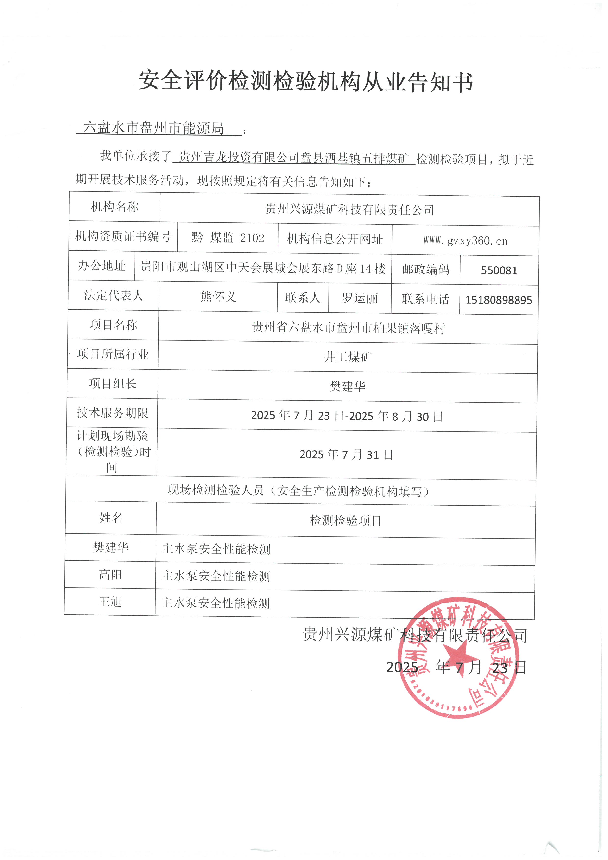 安全評價檢測檢驗機構從業告知書[貴州吉龍投資有限公司盤縣灑基鎮五排煤礦]