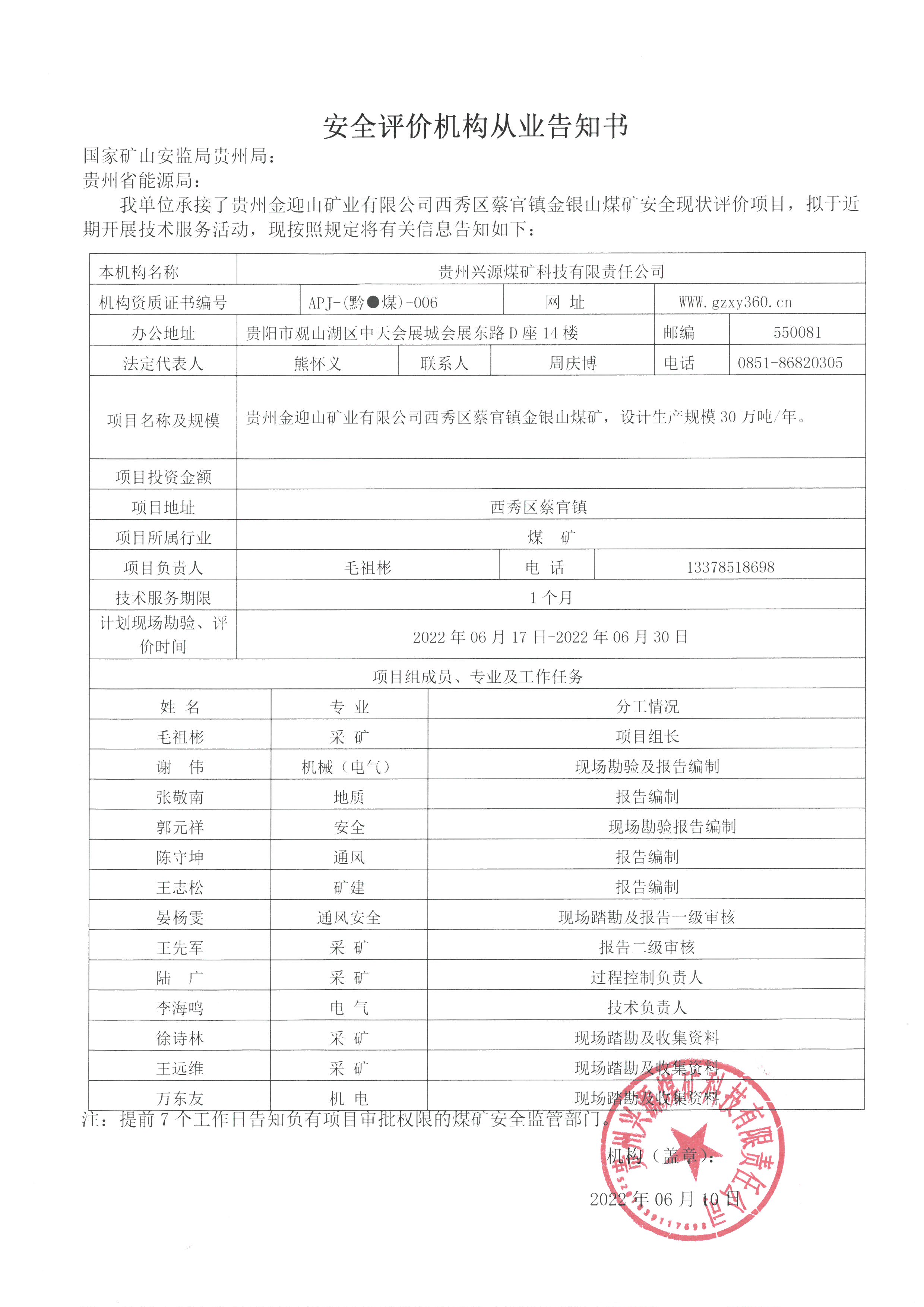 安全評價機構從業告知書(貴州金迎山礦業有限公司西秀區蔡官鎮金銀山煤礦安全現狀評價)