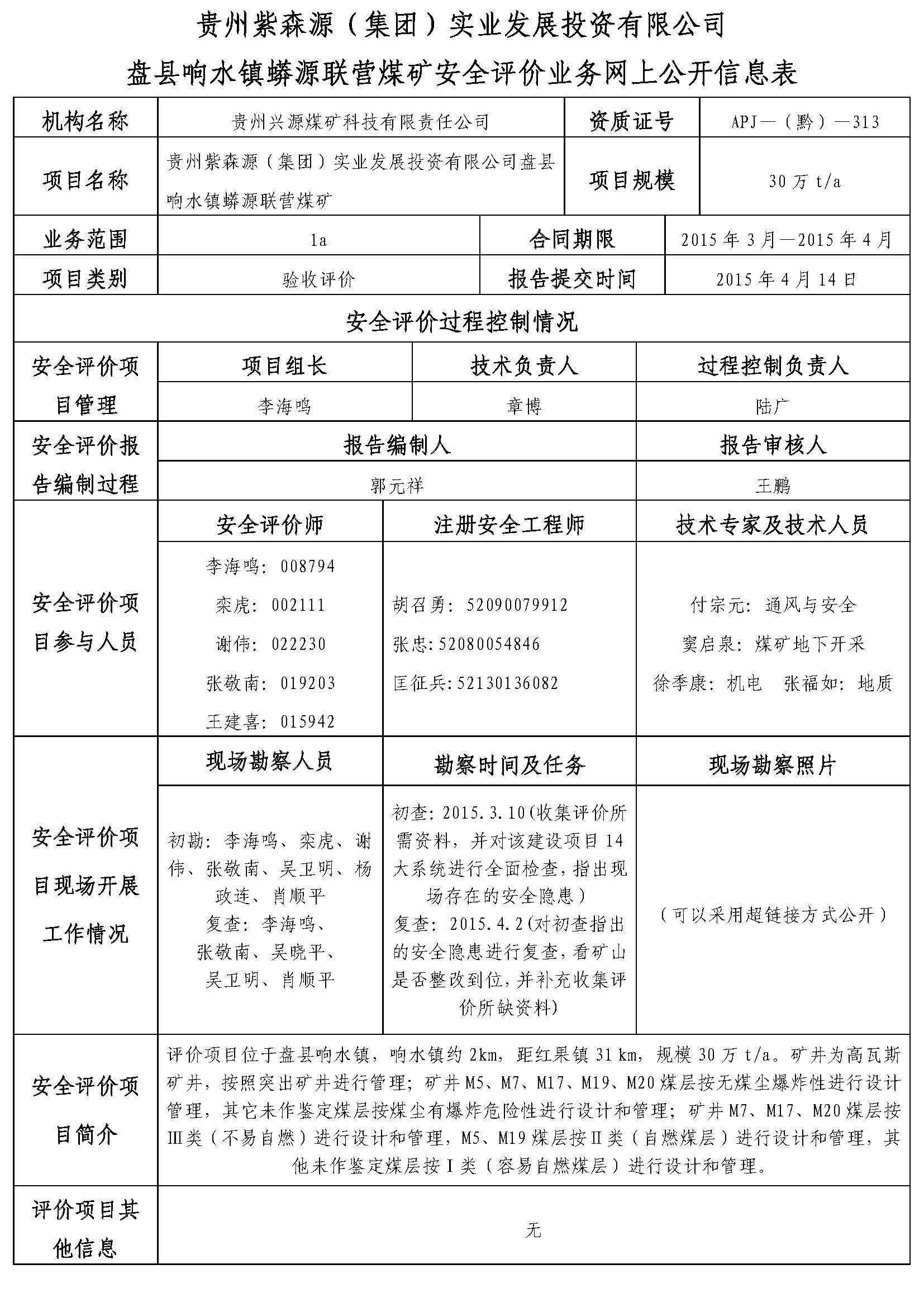 貴州紫森源(集團)實業發展投資有限公司盤縣響水鎮蟒源聯營煤礦安全評價業務網上公開信息表