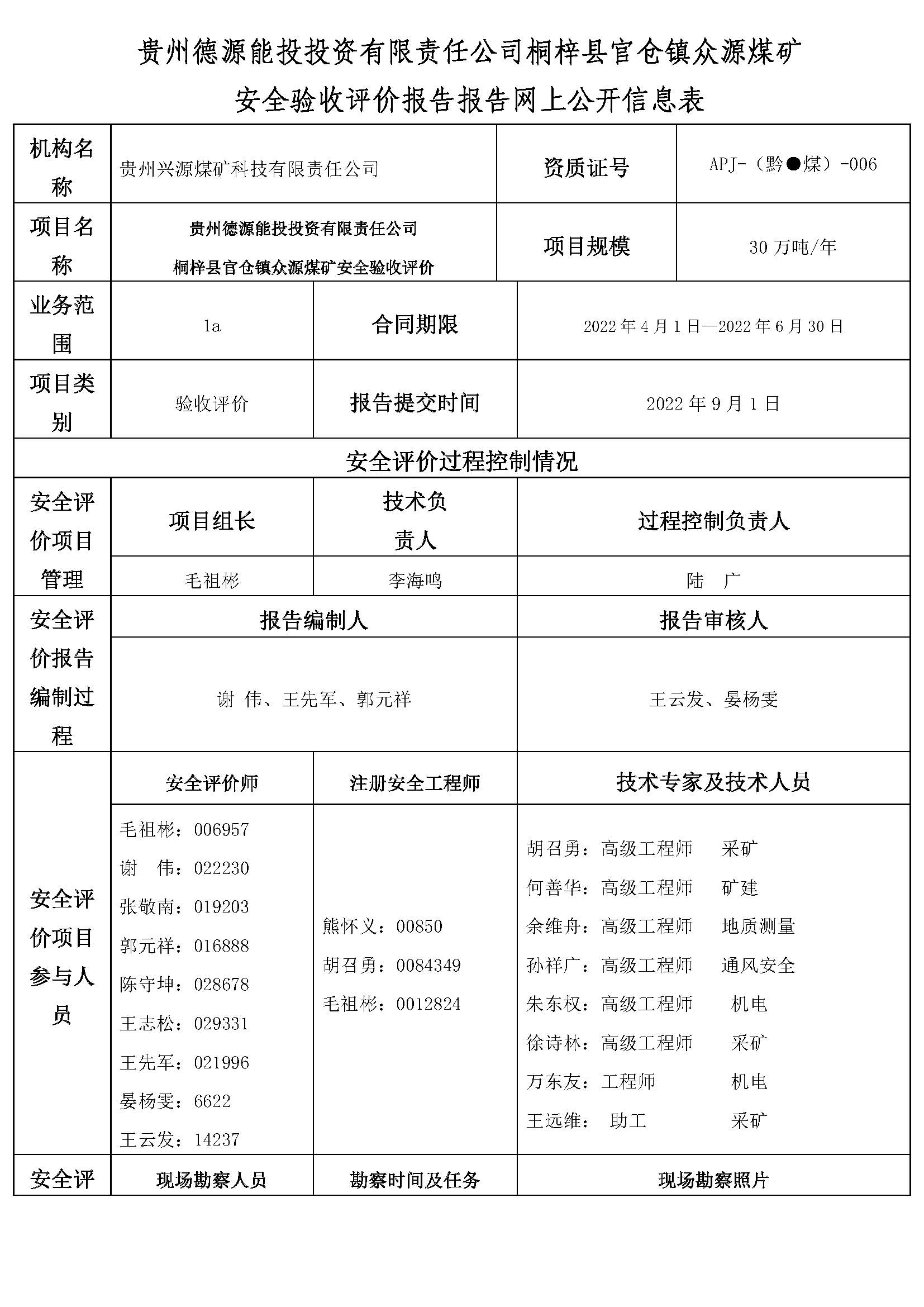 貴州德源能投投資有限責任公司桐梓縣官倉鎮眾源煤礦安全驗收評價報告報告網上公開信息表