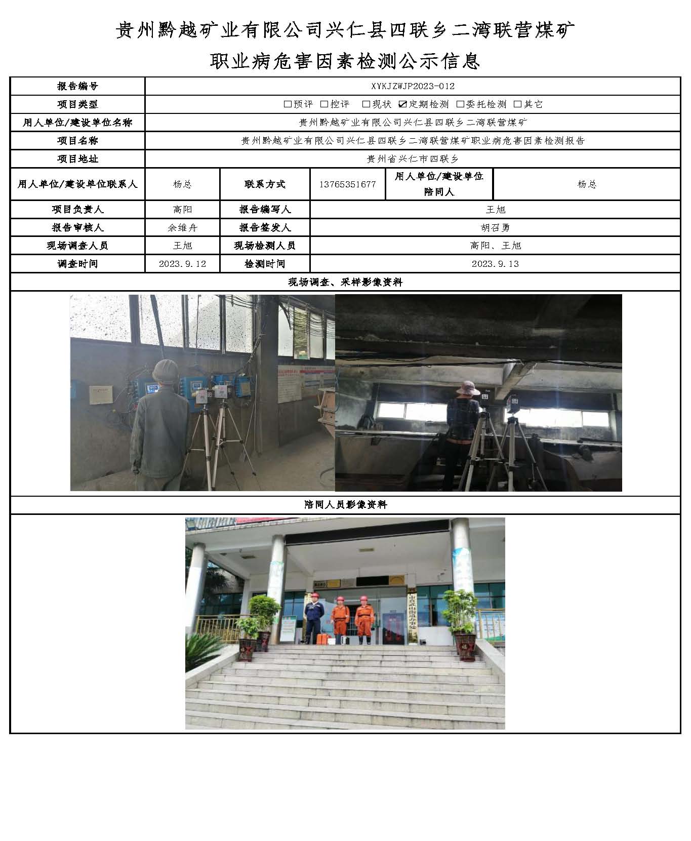 貴州黔越礦業有限公司興仁縣四聯鄉二灣聯營煤礦 職業病危害因素檢測公示信息