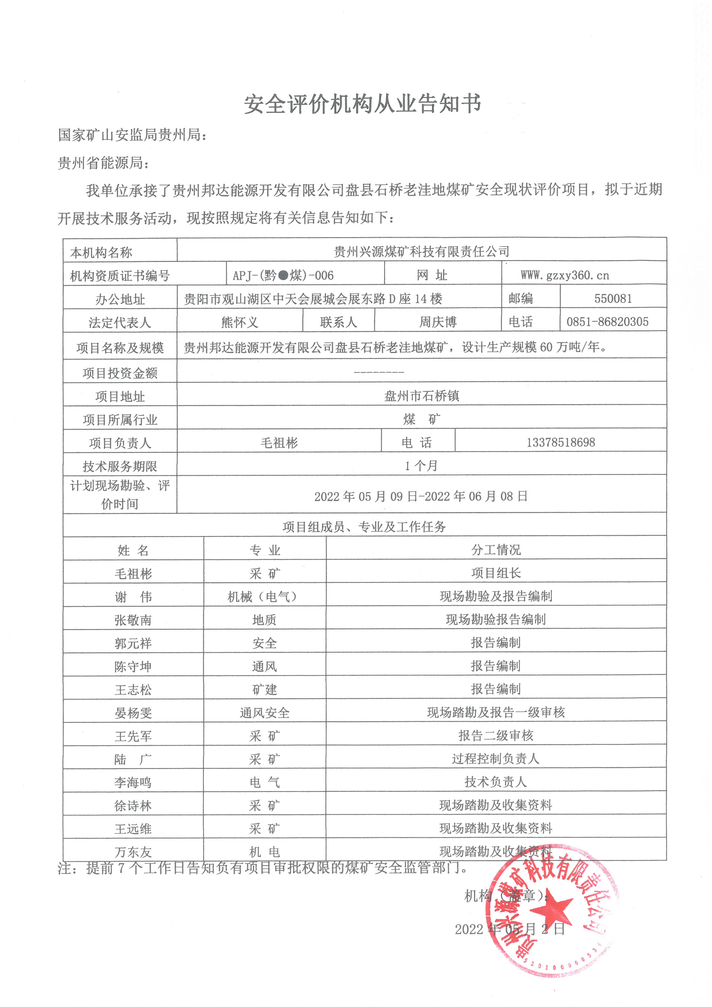 安全評價機構從業告知書(貴州邦達能源開發有限公司盤縣石橋老洼地煤礦)