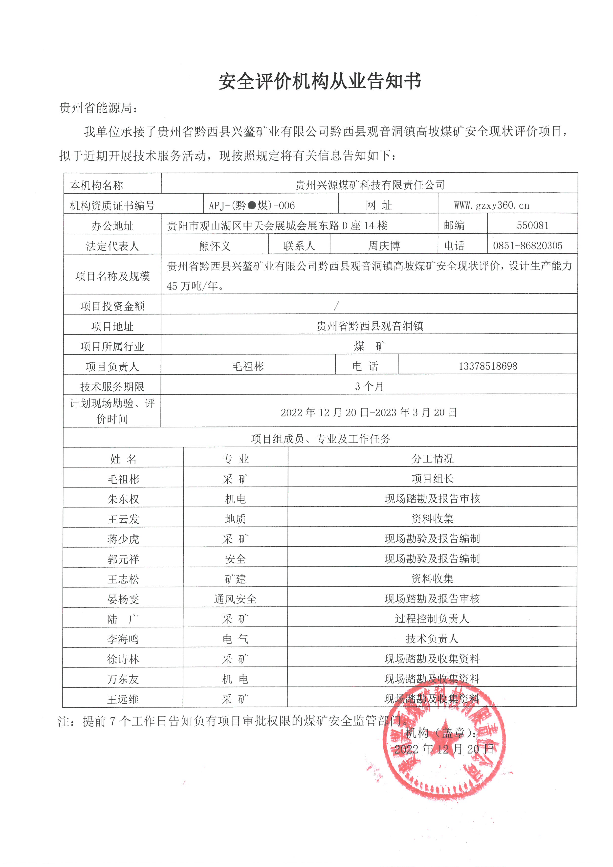 安全評價(jià)機(jī)構(gòu)從業(yè)告知書【貴州省黔西縣興鰲礦業(yè)有限公司黔西縣觀音洞鎮(zhèn)高坡煤礦】