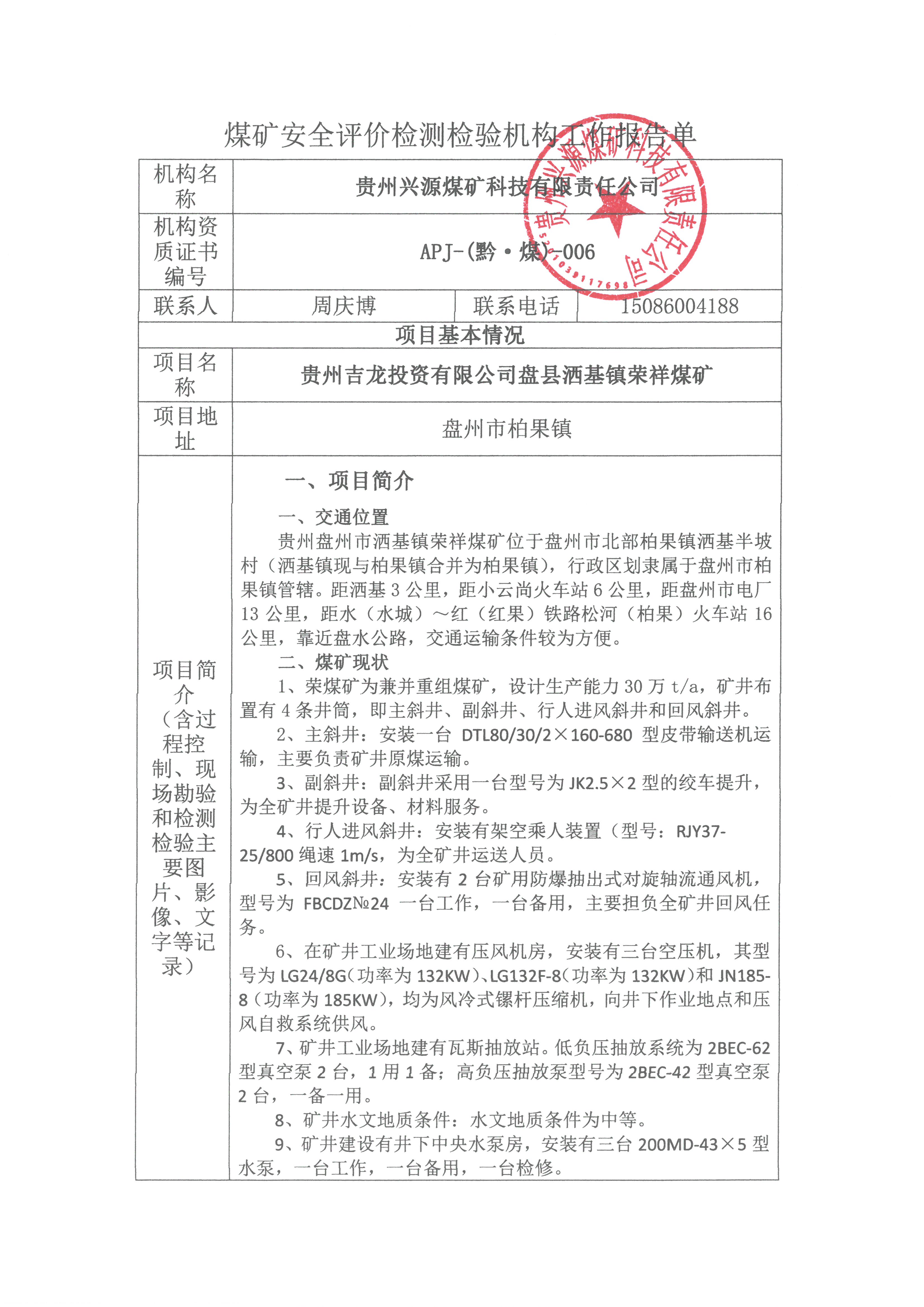 煤礦安全評價(jià)檢測檢驗(yàn)機(jī)構(gòu)工作報(bào)告單【貴州吉龍投資有限公司盤縣灑基鎮(zhèn)榮祥煤礦安全現(xiàn)狀評價(jià)】