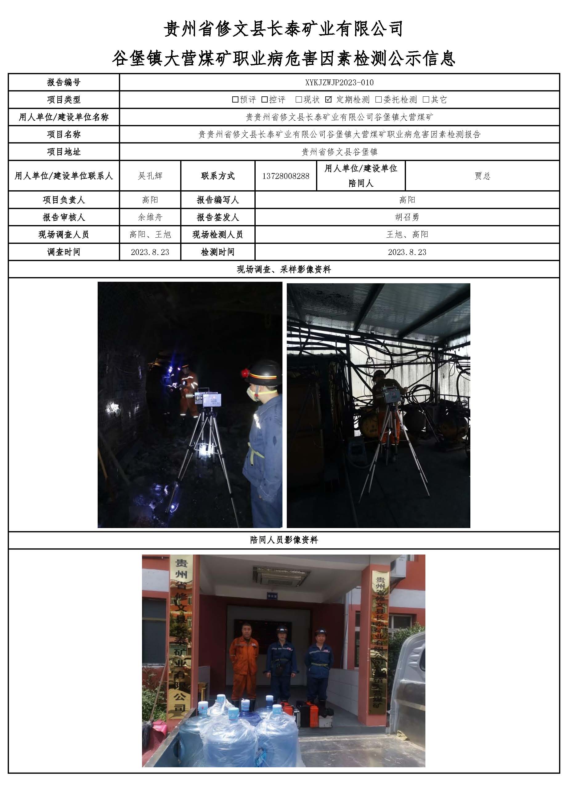 貴州省修文縣長泰礦業有限公司谷堡鎮大營煤礦職業病危害因素檢測公示信息
