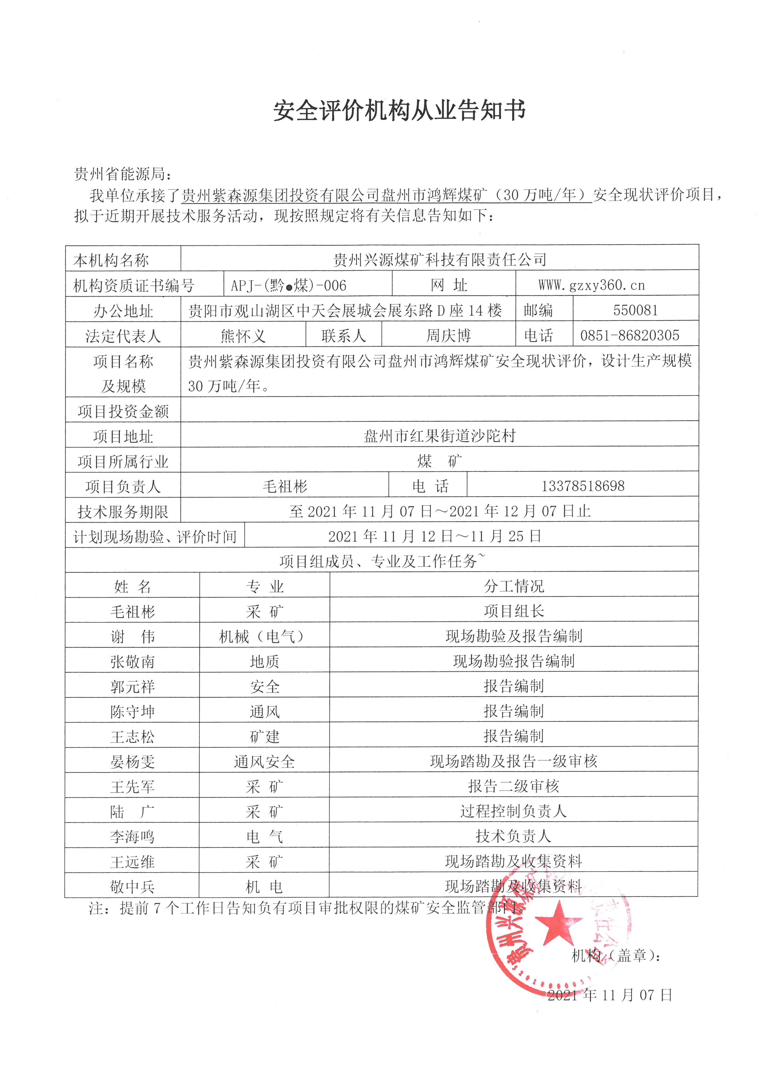 安全評價機構從業告知書(六盤水市鐘山區鎮藝煤礦(30萬噸年))