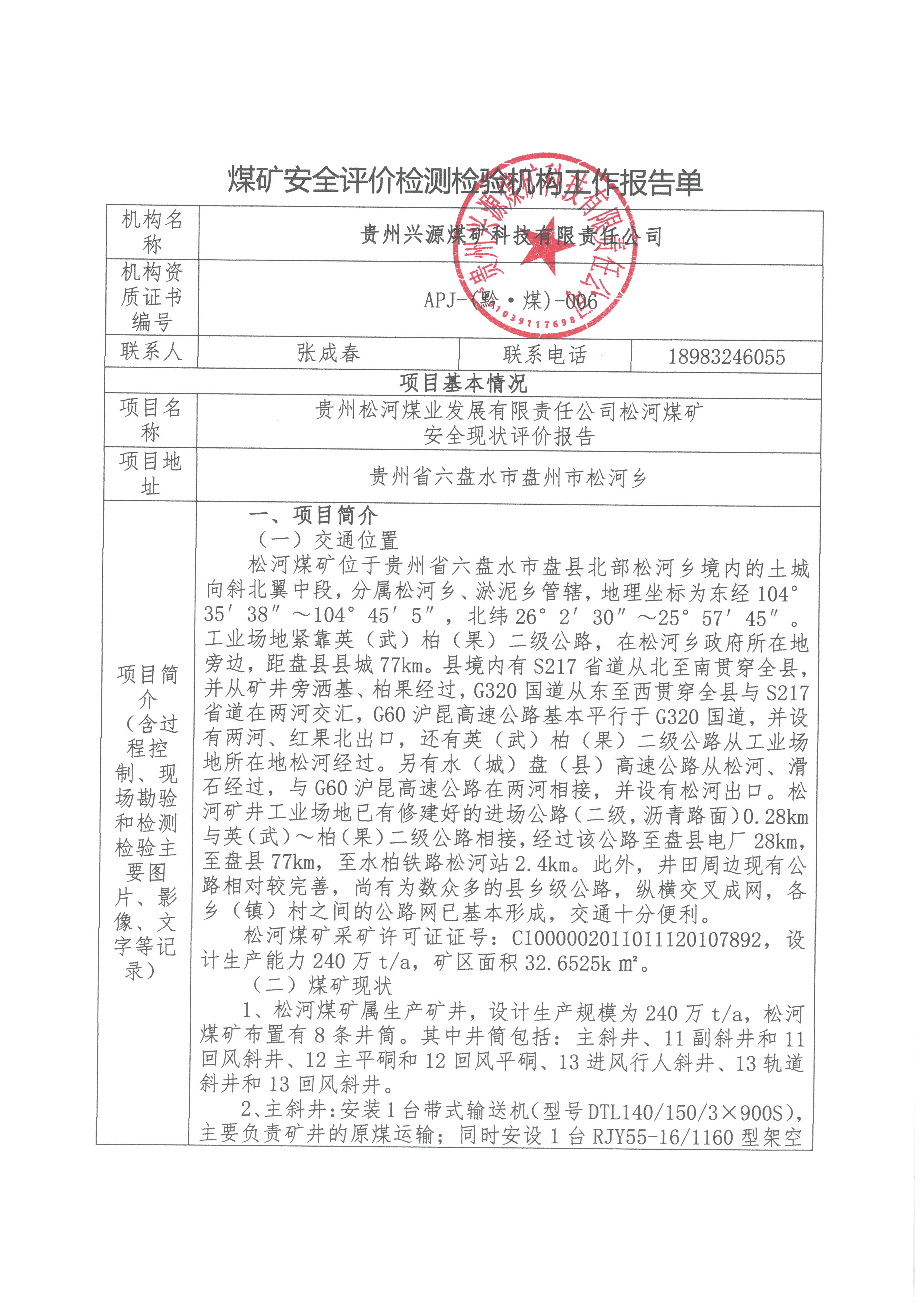 煤礦安全評價檢測檢驗機構工作報告單【貴州松河煤業發展有限責任公司松河煤礦 安全現狀評價報告】