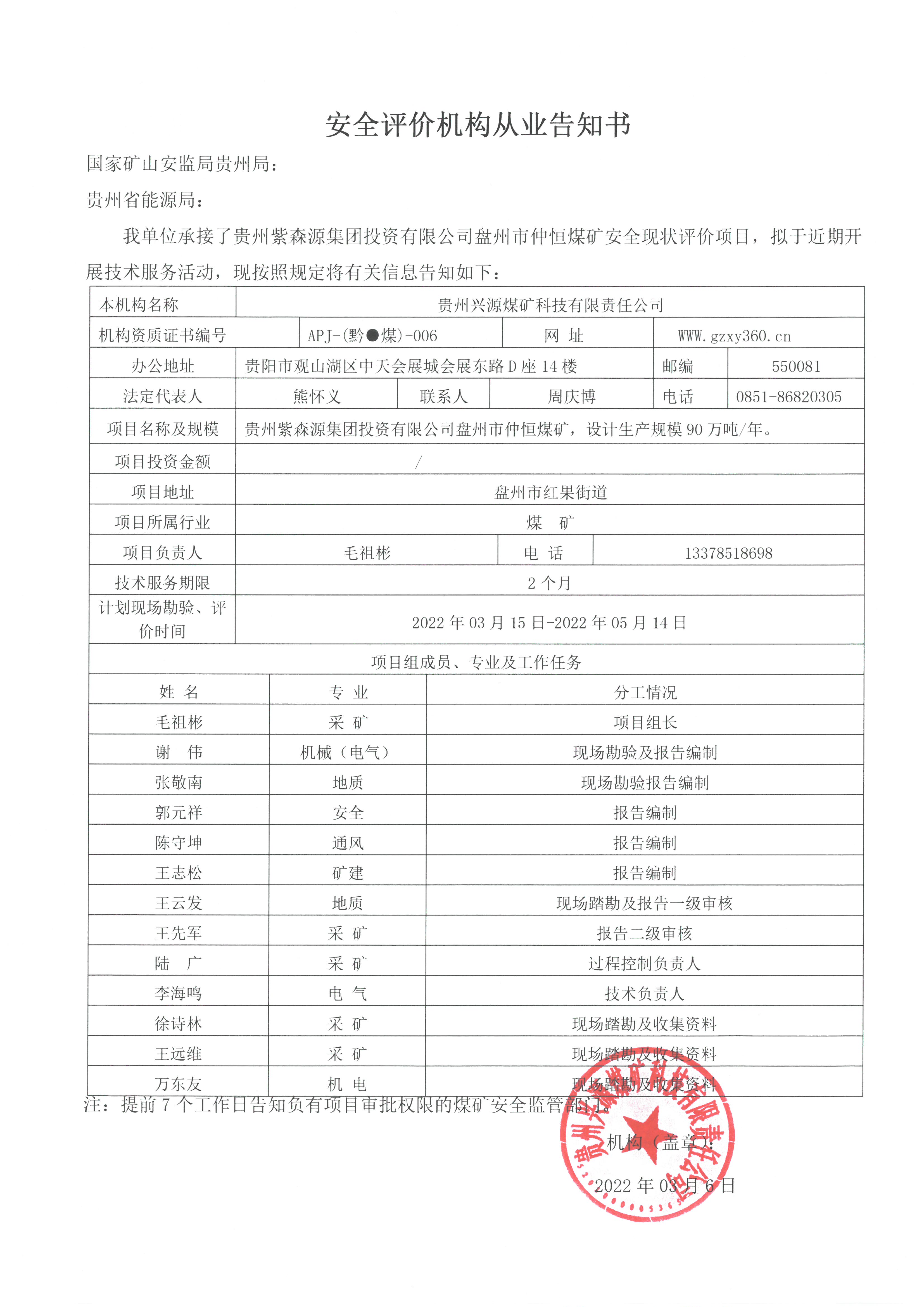 安全評價機構從業告知書(貴州紫森源集團投資有限公司盤州市仲恒煤礦安全現狀評價)