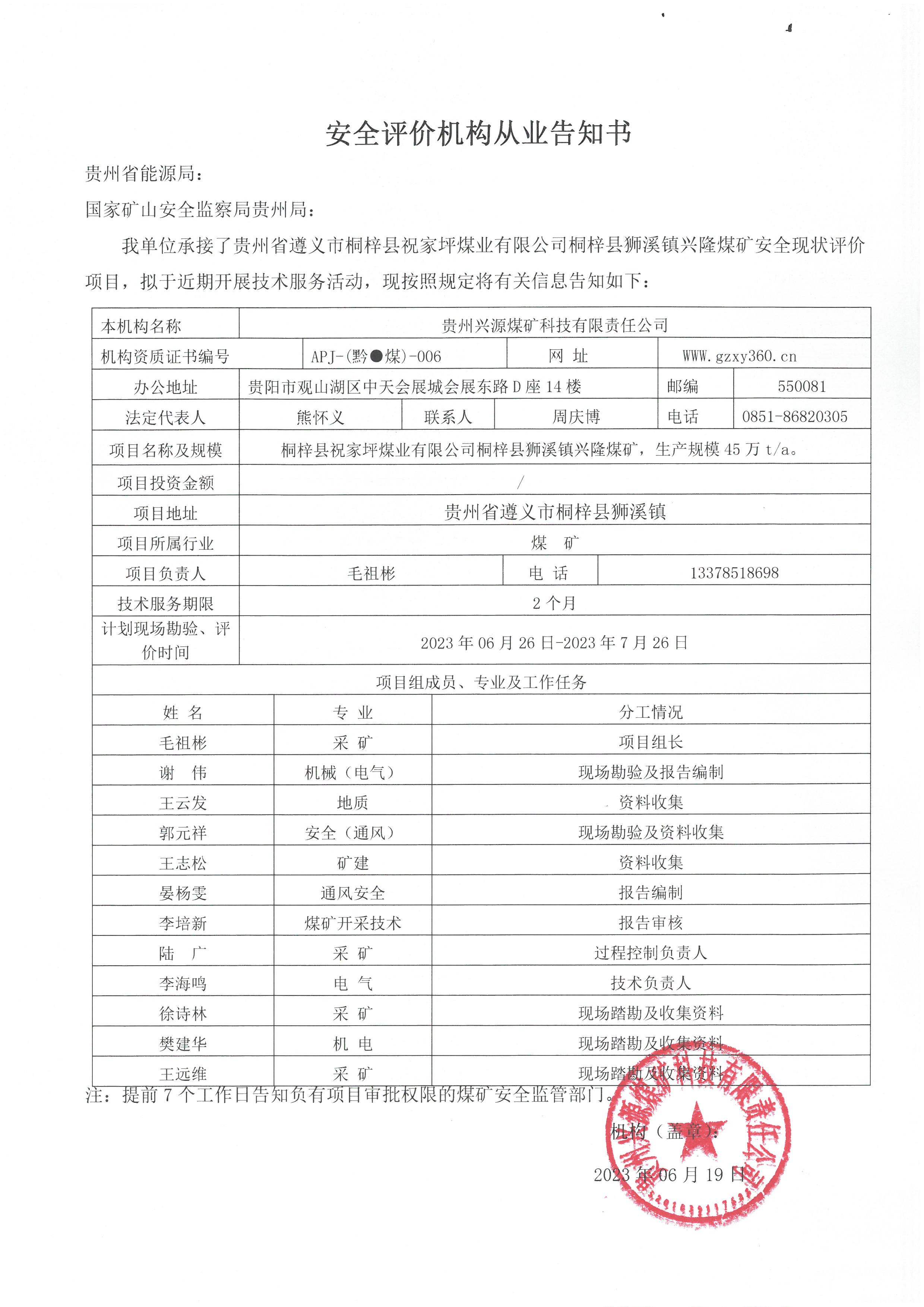 【安全評價機構從業告知書】貴州省遵義市桐梓縣祝家坪煤業有限公司桐梓縣獅溪鎮興隆煤礦安全現狀評價