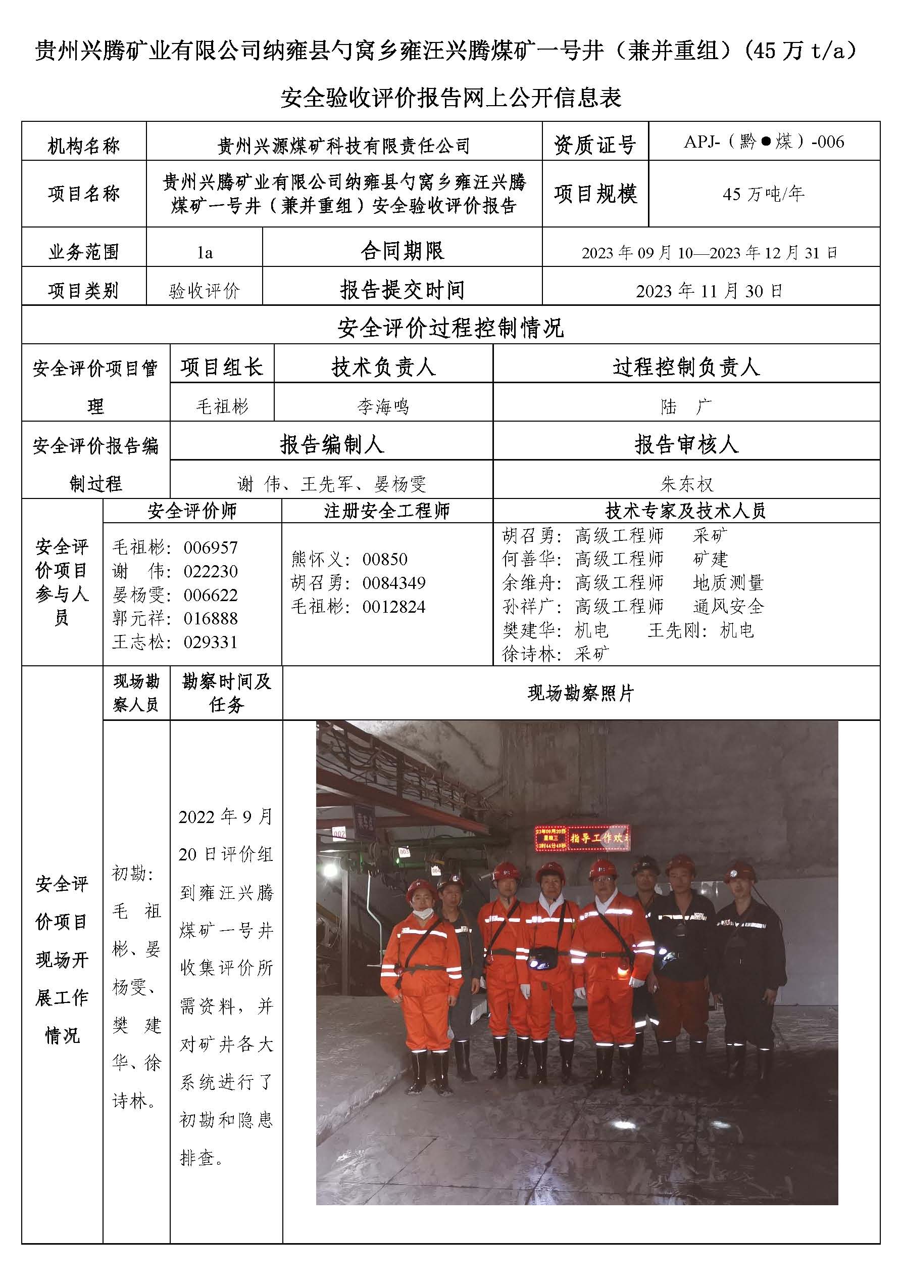貴州興騰礦業有限公司納雍縣勺窩鄉雍汪興騰煤礦一號井(兼并重組)(45萬t/a)安全驗收評價報告網上公開信息表