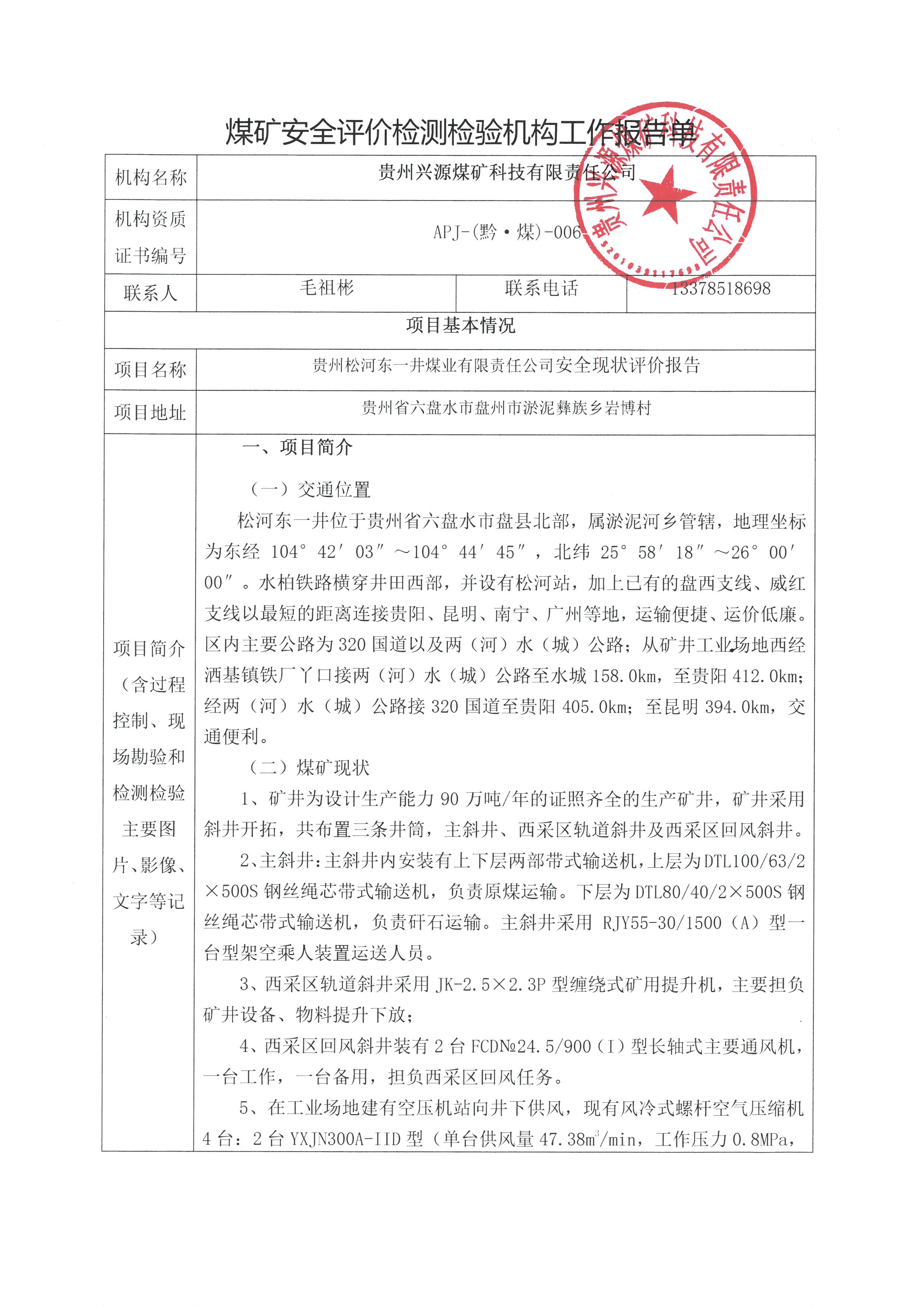 煤礦安全評價檢測檢驗機構工作報告單【貴州松河東一井煤業有限責任公司安全現狀評價報告】
