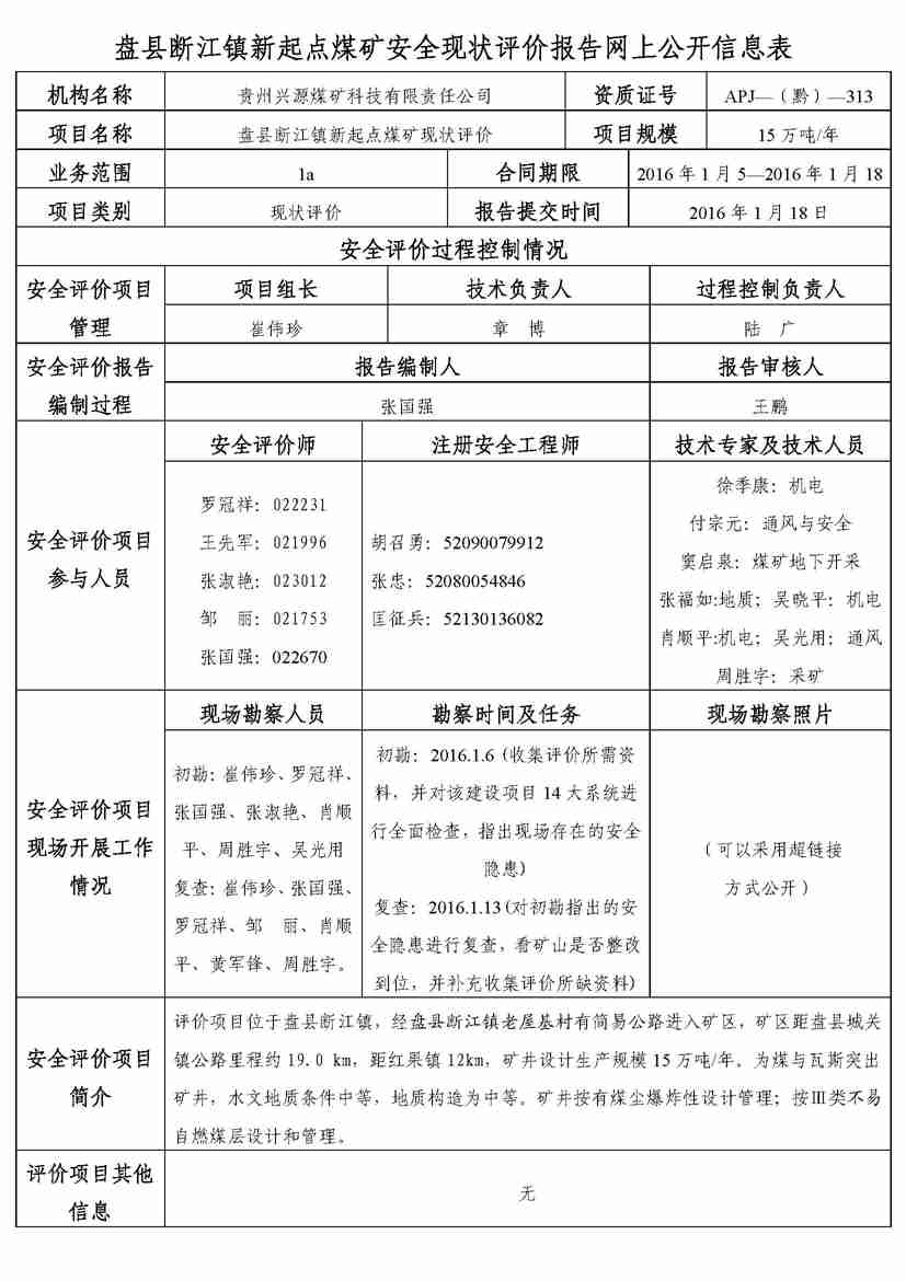 盤縣斷江鎮(zhèn)新起點(diǎn)煤礦安全現(xiàn)狀評價報告網(wǎng)上公開信息表