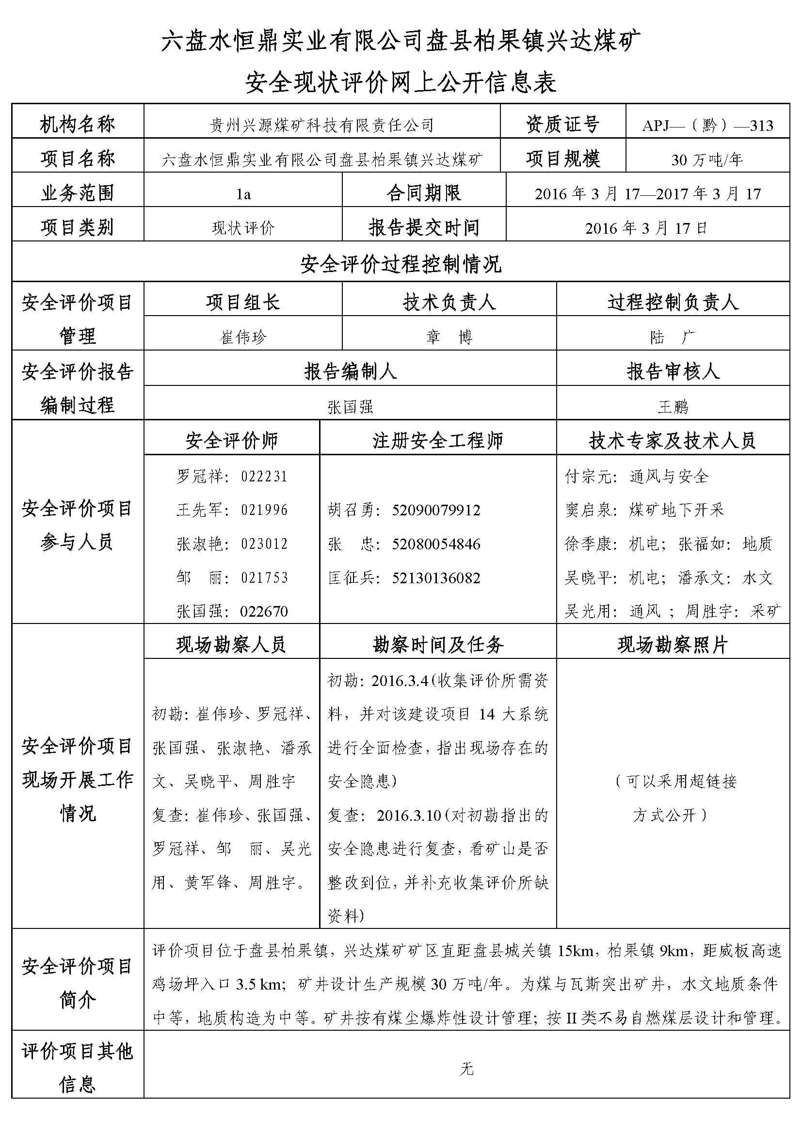 六盤水恒鼎實業有限公司盤縣柏果鎮興達煤礦安全現狀評價網上公開信息表