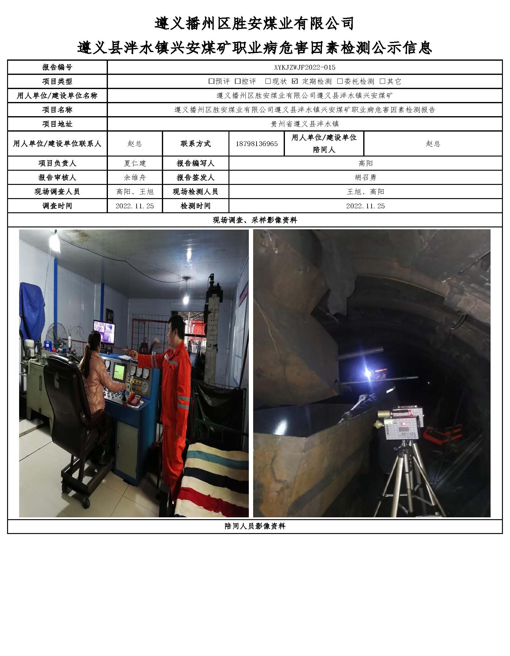 遵義播州區勝安煤業有限公司 遵義縣泮水鎮興安煤礦職業病危害因素檢測公示信息