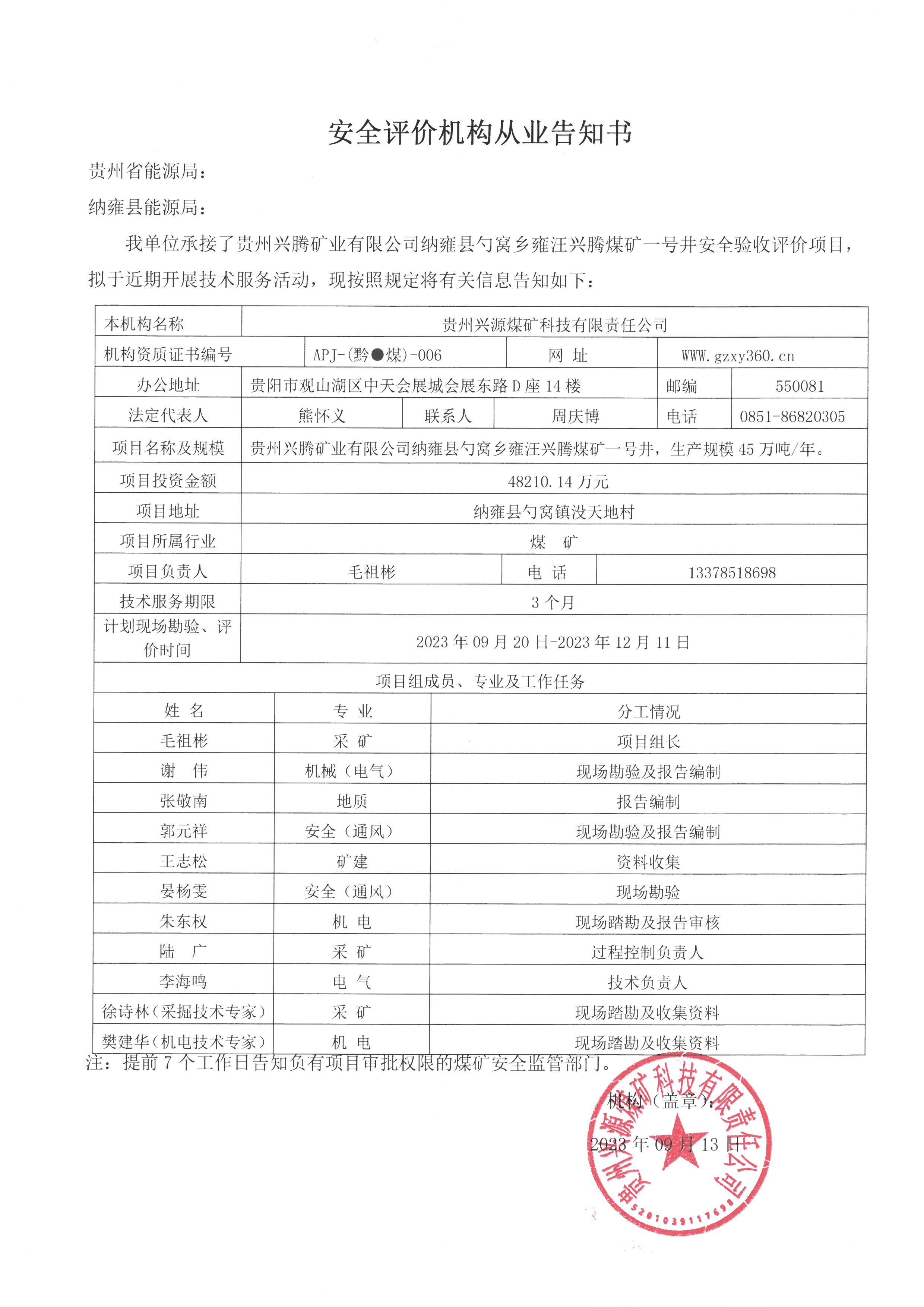 安全評價機構從業告知書【貴州興騰礦業有限公司納雍縣勺窩鄉雍汪興騰煤礦一號井安全驗收評價項目】