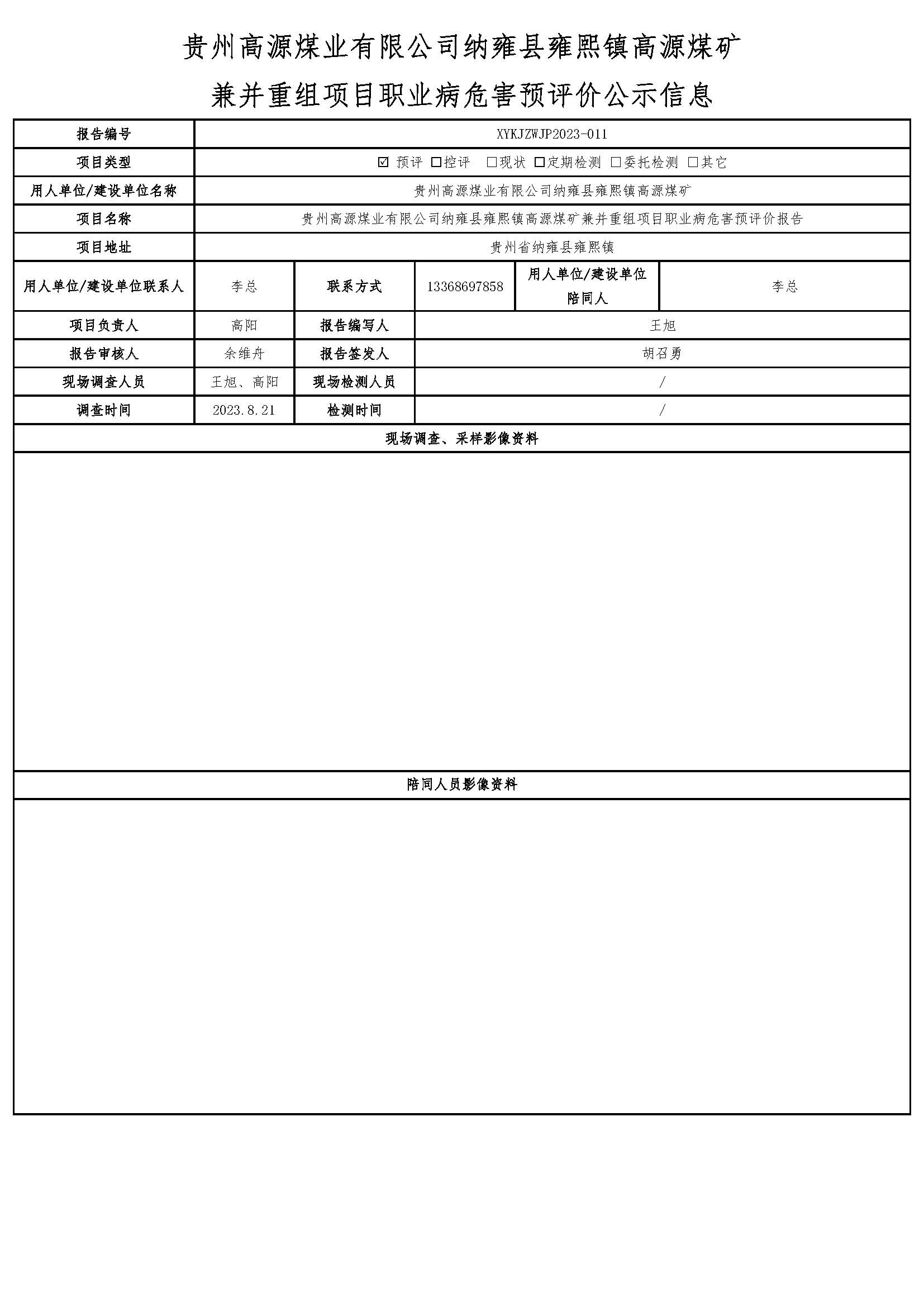 貴州高源煤業有限公司納雍縣雍熙鎮高源煤礦 兼并重組項目職業病危害預評價公示信息