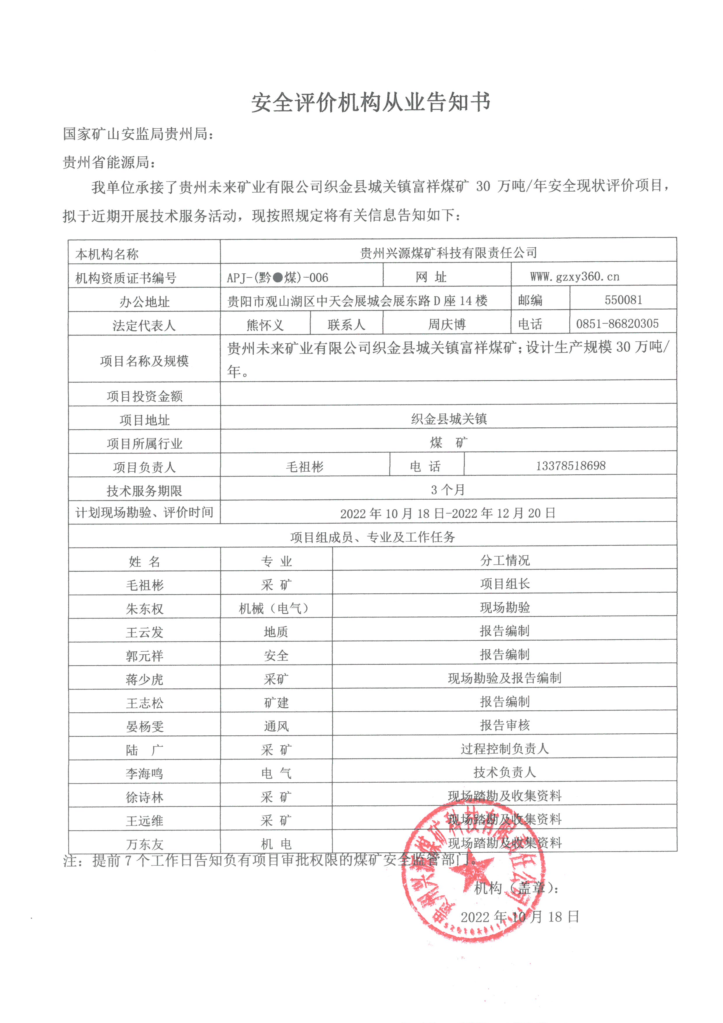 安全評(píng)價(jià)機(jī)構(gòu)從業(yè)告知書(shū)【織金縣城關(guān)鎮(zhèn)富祥煤礦30萬(wàn)噸/年安全現(xiàn)狀評(píng)價(jià)】