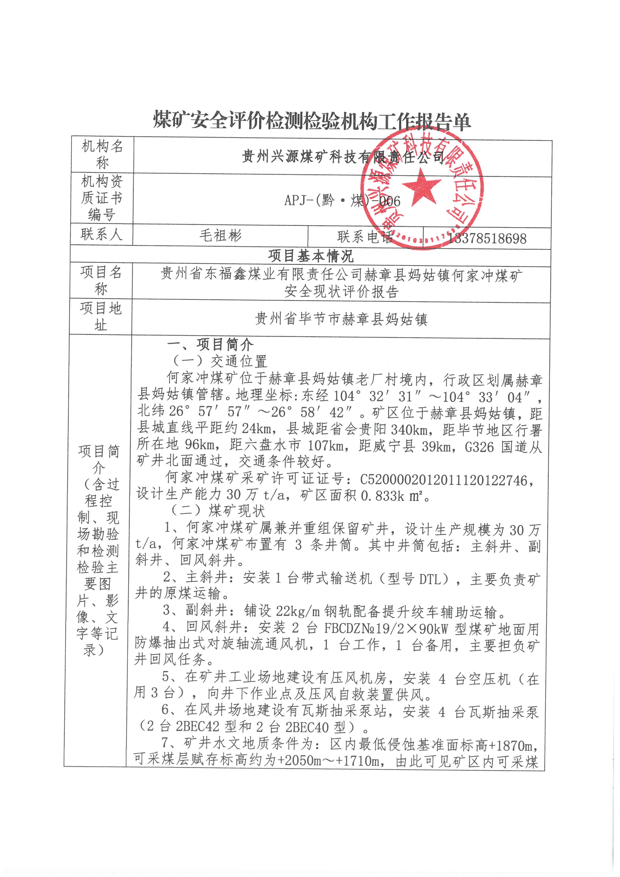 煤礦安全評價檢測檢驗機構工作報告單【貴州省東福鑫煤業有限責任公司赫章縣媽姑鎮何家沖煤礦安全現狀評價報告】