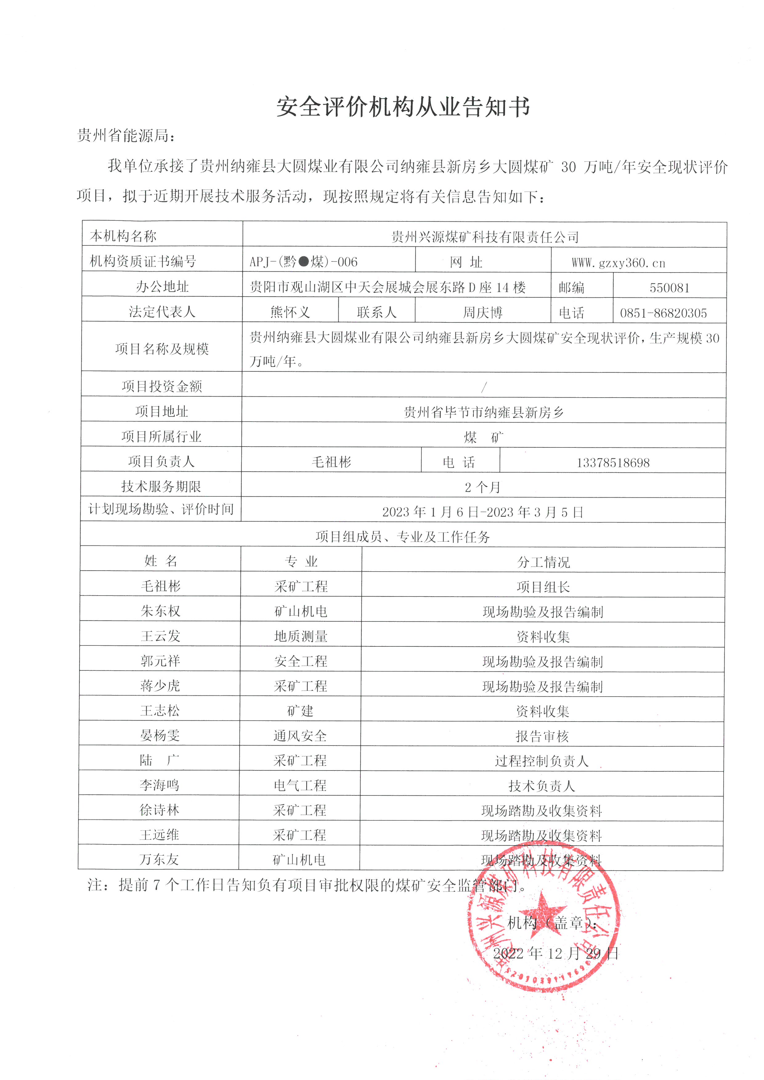 安全評價機構(gòu)從業(yè)告知書【貴州納雍縣大圓煤業(yè)有限公司納雍縣新房鄉(xiāng)大圓煤礦】