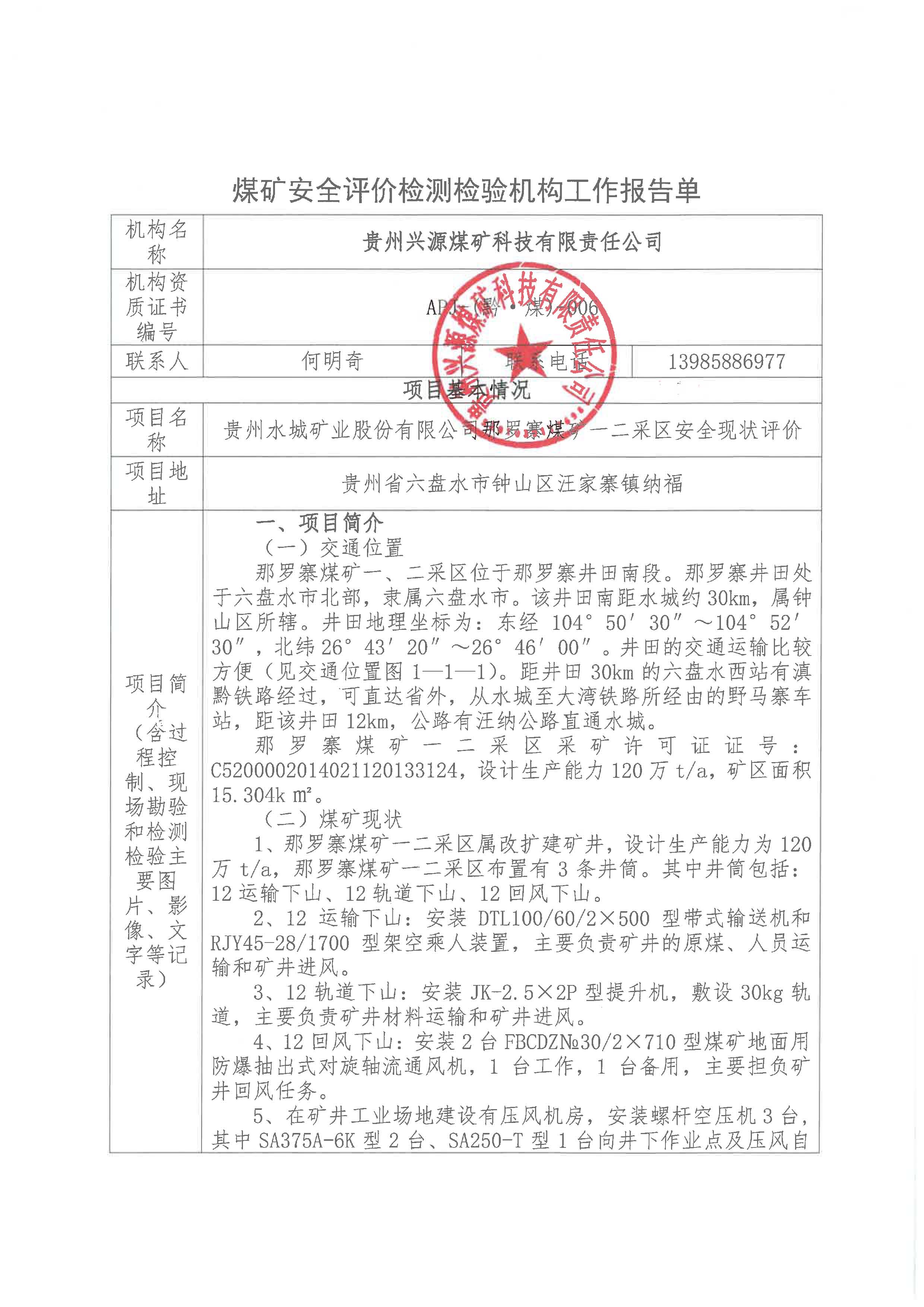 煤礦安全評價檢測檢驗機構(gòu)工作報告單【貴州水城礦業(yè)股份有限公司那羅寨煤礦一二采區(qū)安全現(xiàn)狀評價】