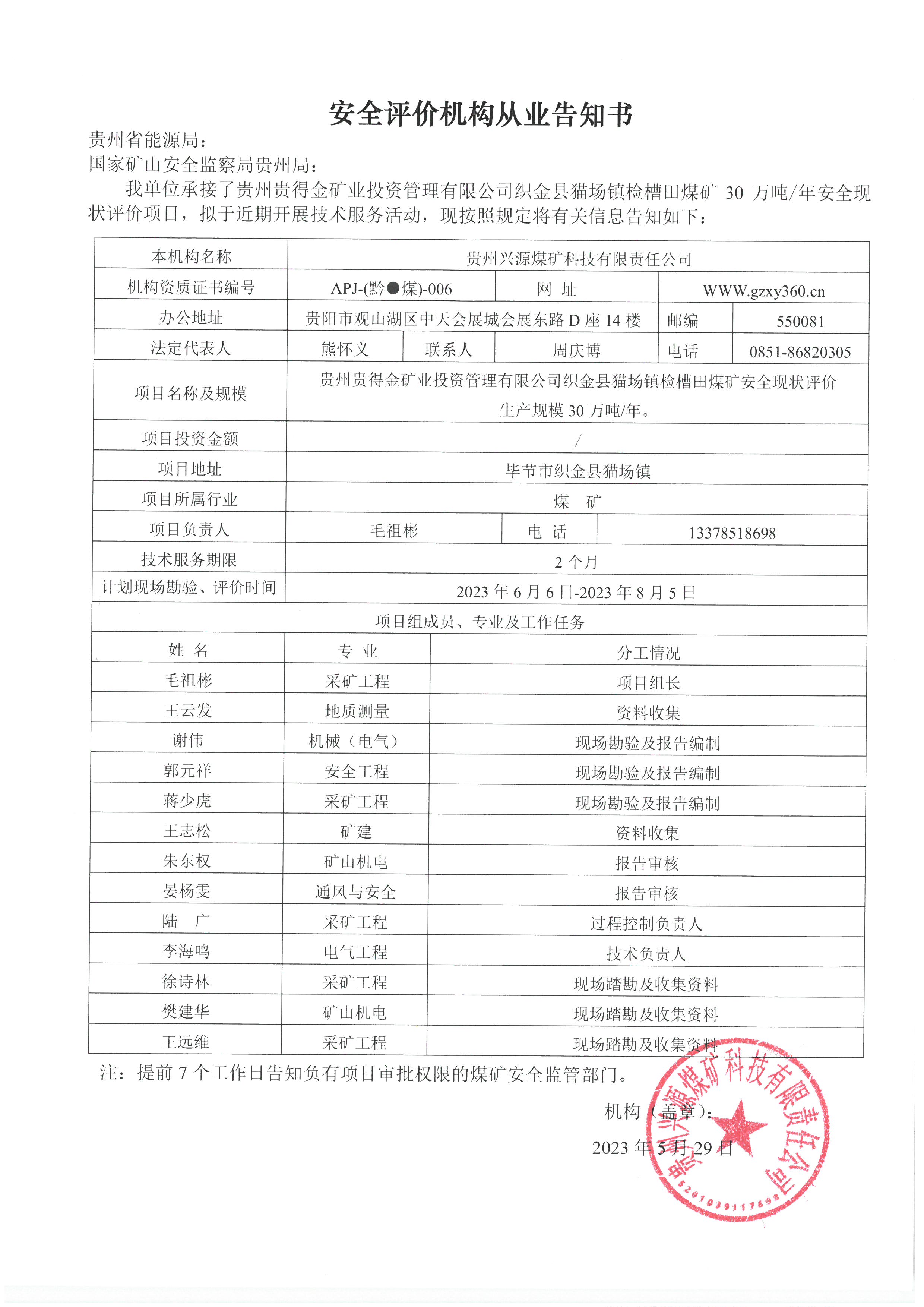 安全評價機構從業告知書【貴州貴得金礦業投資管理有限公司織金縣貓場鎮檢槽田煤礦】