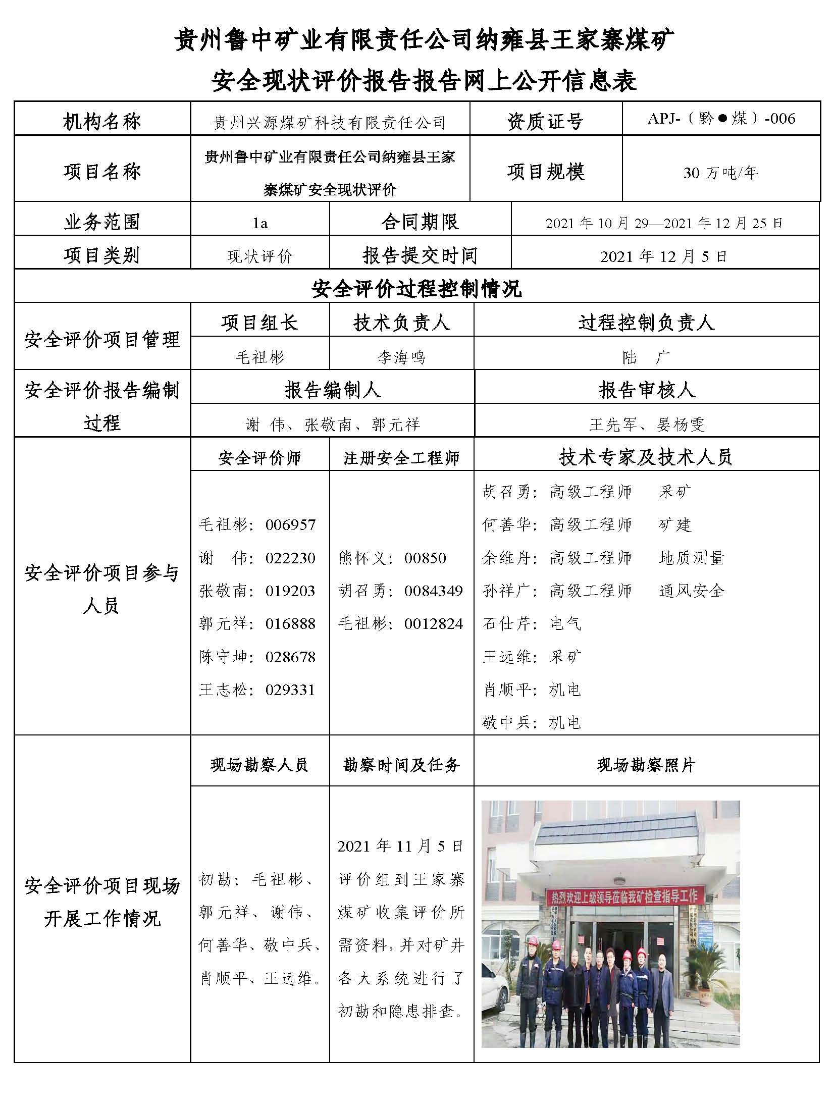 貴州魯中礦業有限責任公司納雍縣王家寨煤礦 安全現狀評價報告報告網上公開信息表
