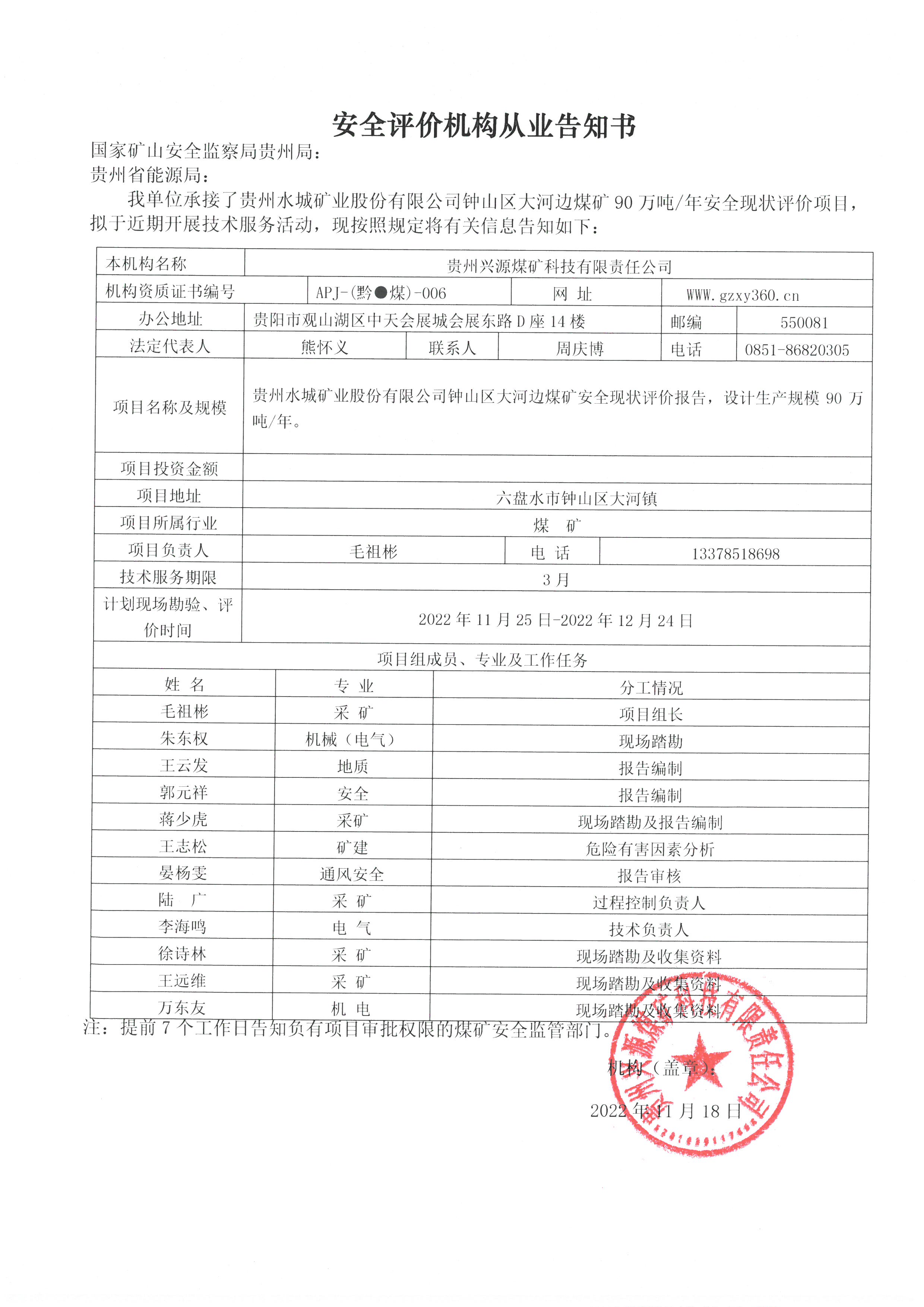 安全評價機構從業告知書【貴州水城礦業股份有限公司鐘山區大河邊煤礦】