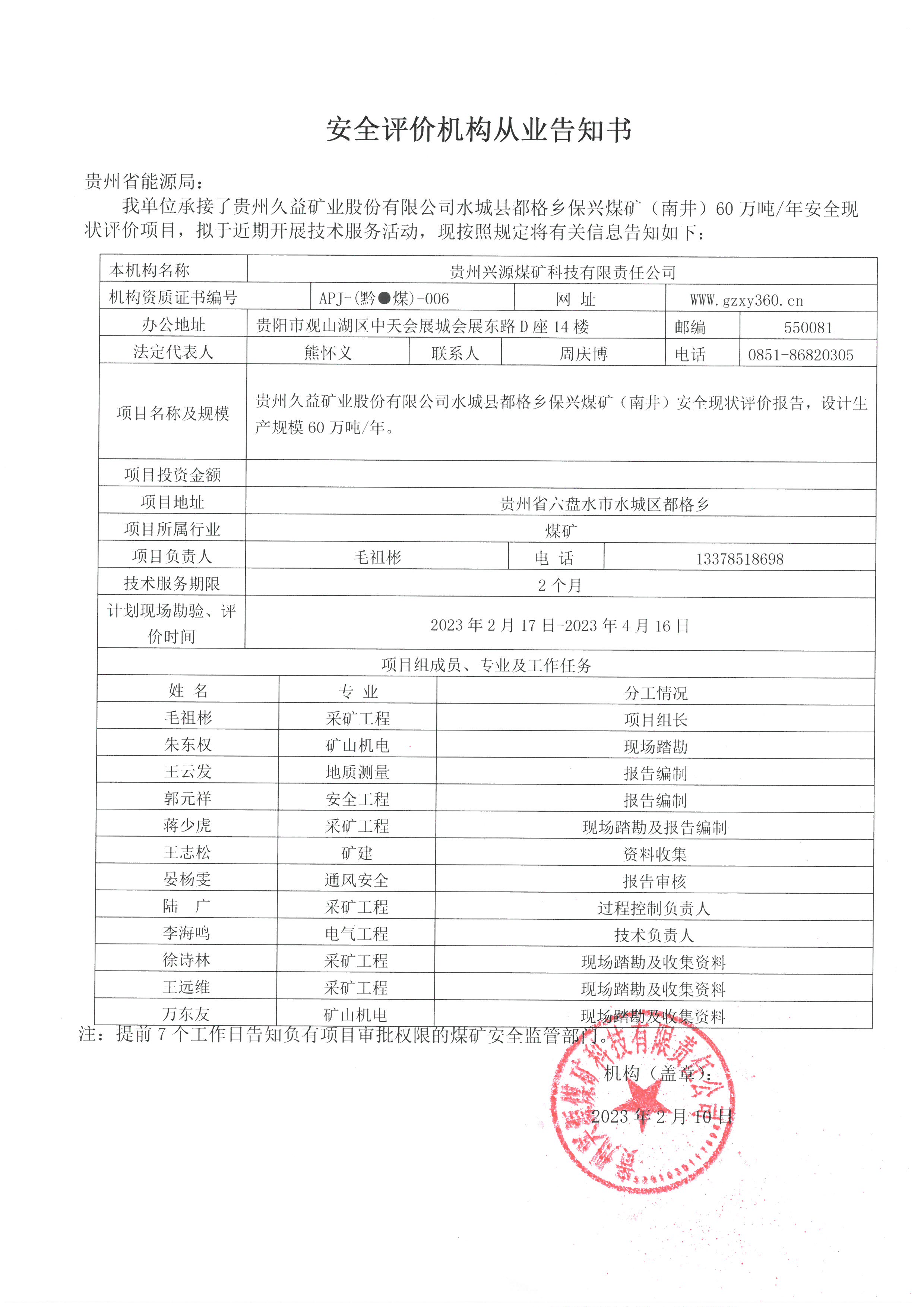 安全評價機構從業告知書【貴州久益礦業股份有限公司水城縣都格鄉保興煤礦(南井)60萬噸年安全現狀評價】