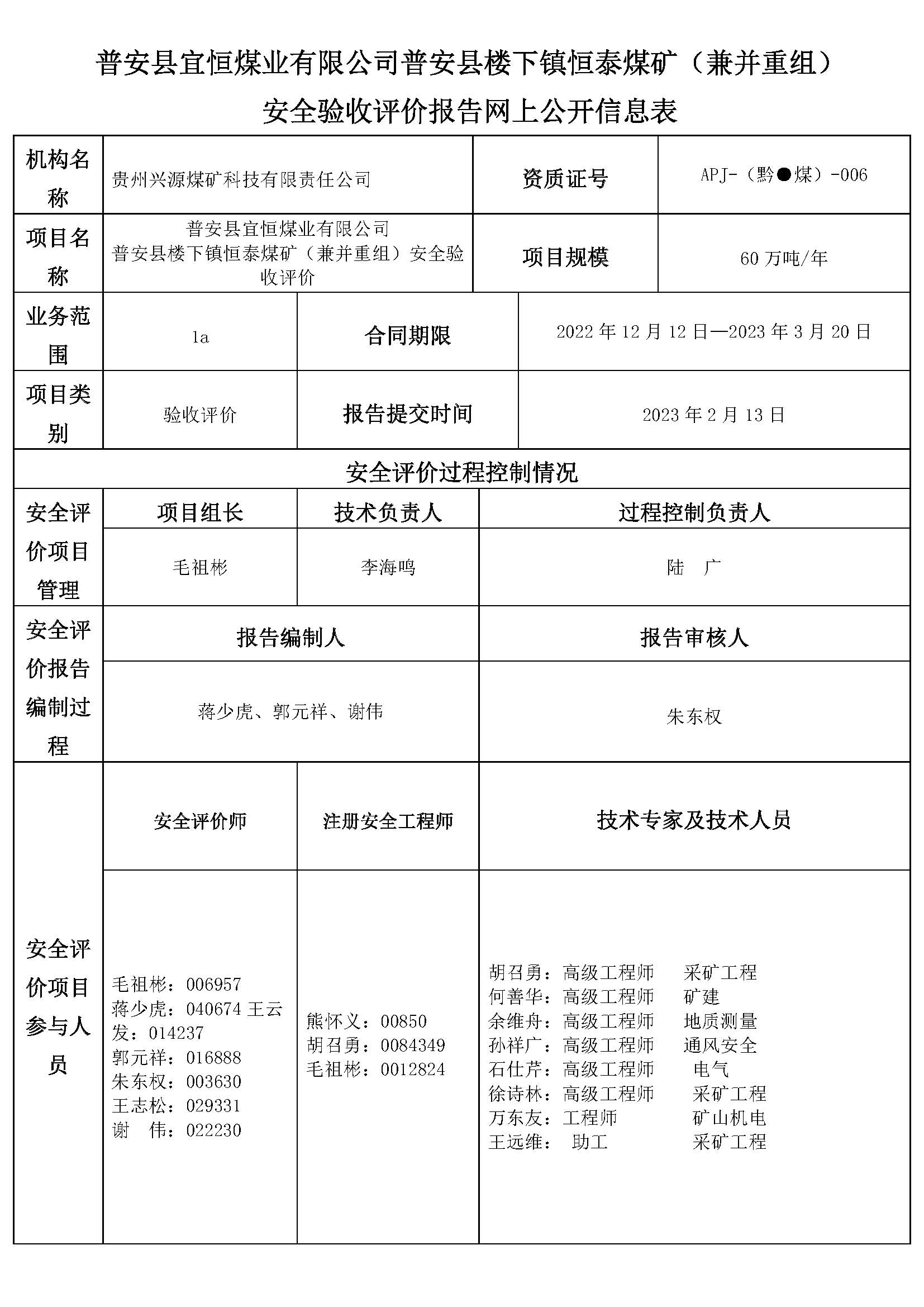 普安縣宜恒煤業有限公司普安縣樓下鎮恒泰煤礦(兼并重組) 安全驗收評價報告網上公開信息表