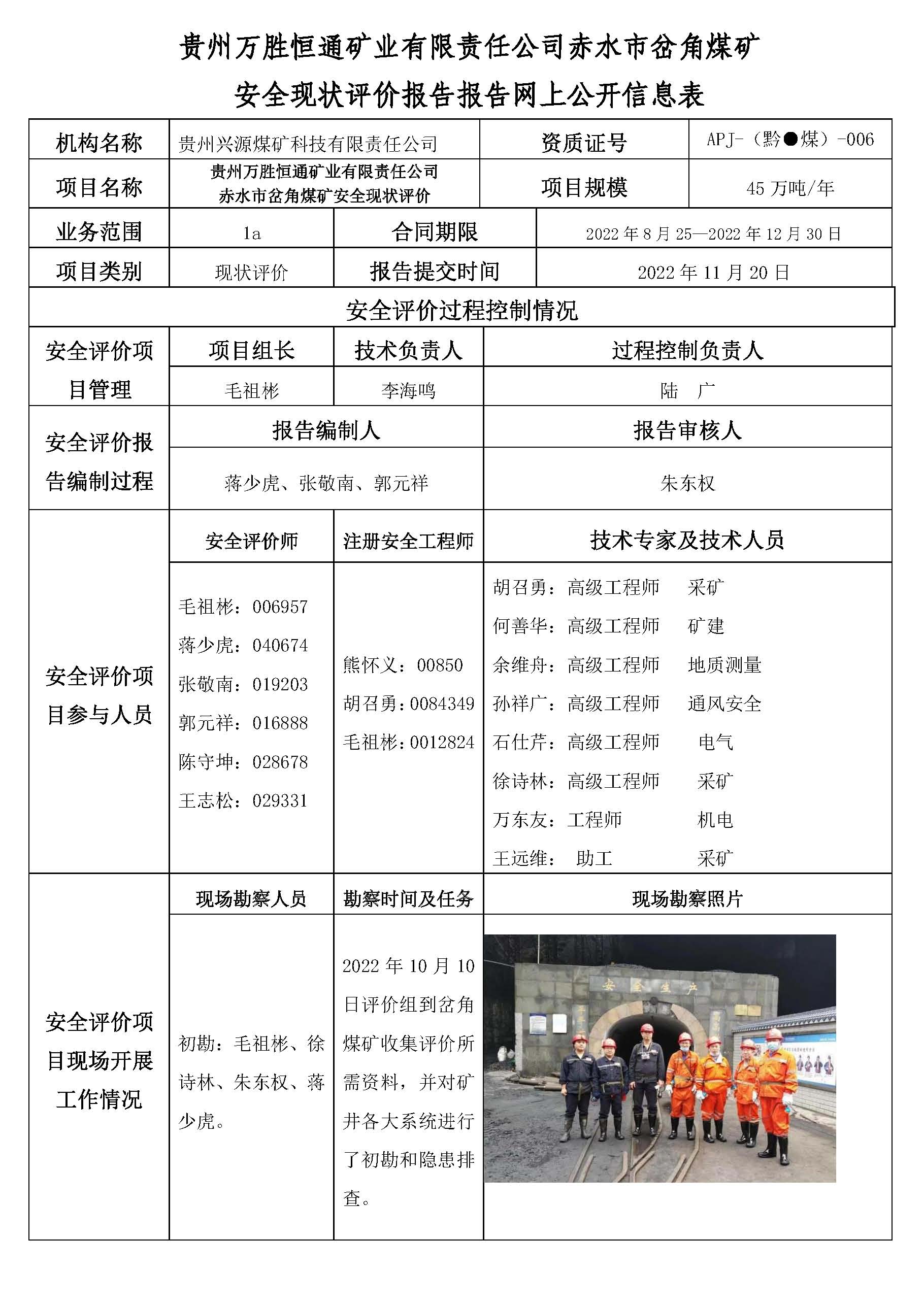 貴州萬(wàn)勝恒通礦業(yè)有限責(zé)任公司赤水市岔角煤礦 安全現(xiàn)狀評(píng)價(jià)報(bào)告報(bào)告網(wǎng)上公開(kāi)信息表