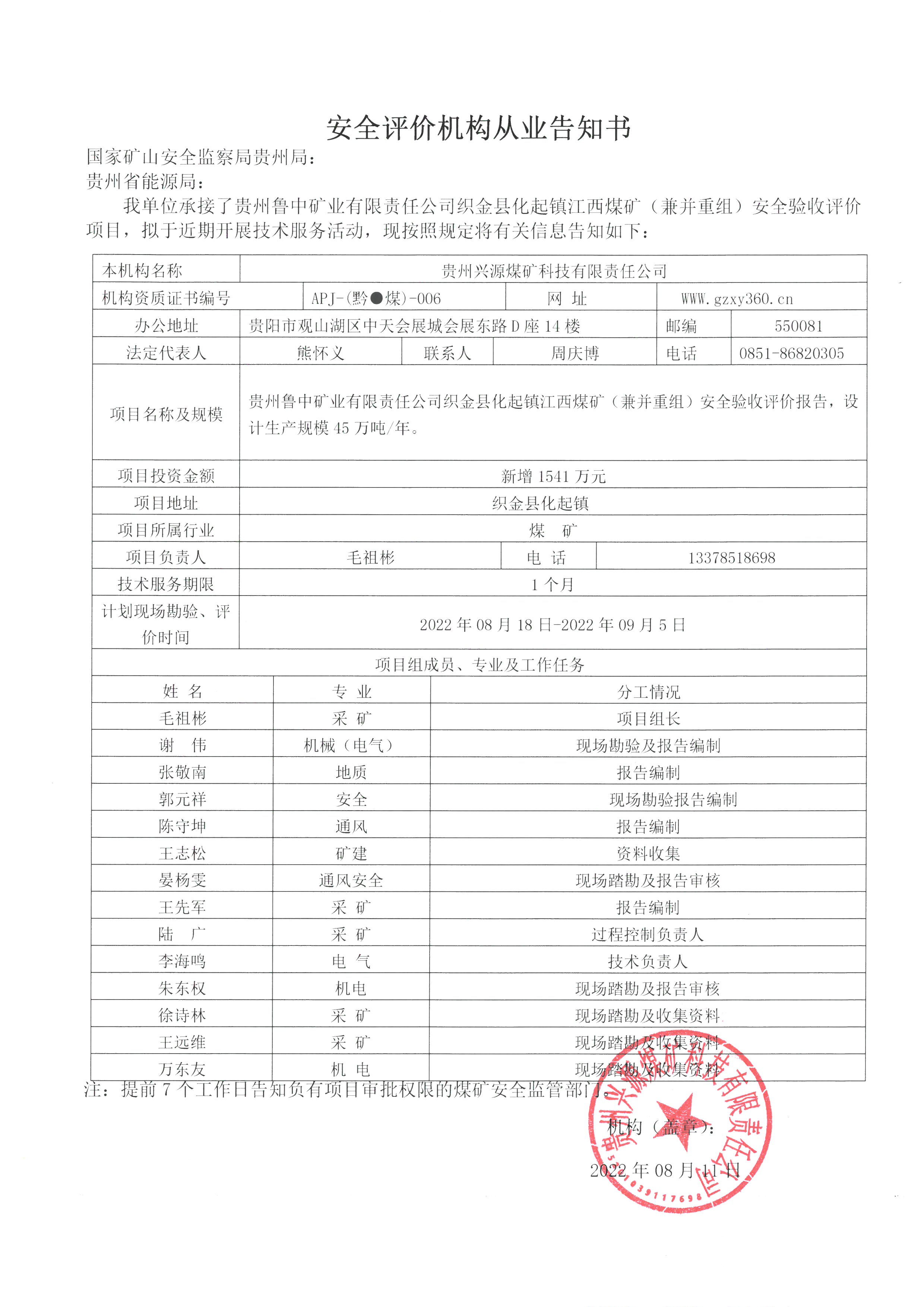 安全評(píng)價(jià)機(jī)構(gòu)從業(yè)告知書(shū)【貴州魯中礦業(yè)有限責(zé)任公司織金縣化起鎮(zhèn)江西煤礦(兼并重組)安全驗(yàn)收評(píng)價(jià)】