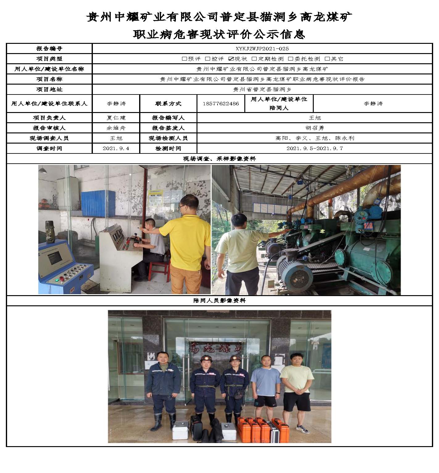 貴州中耀礦業有限公司普定縣貓洞鄉高龍煤礦 職業病危害現狀評價公示信息