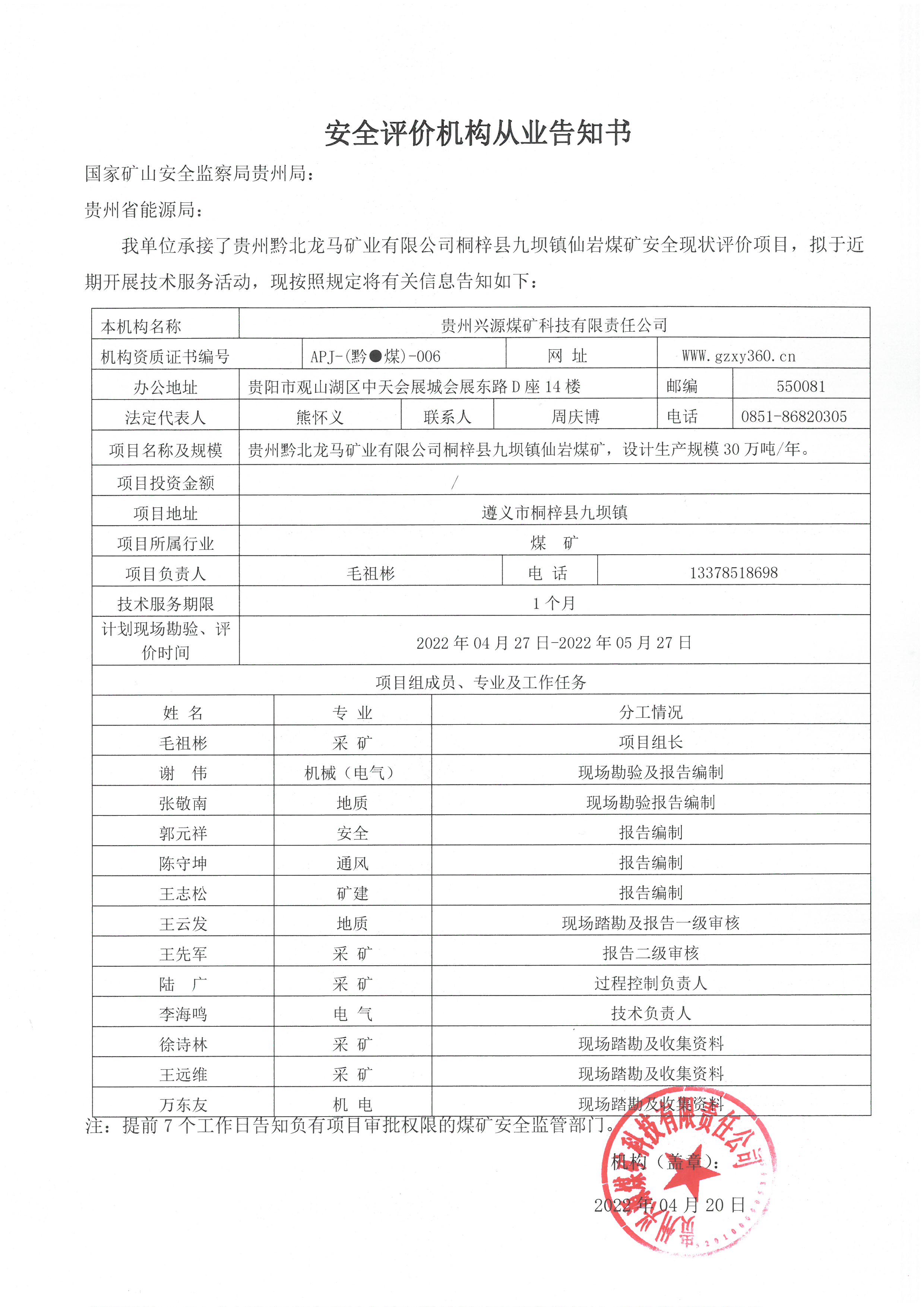 安全評價機構從業告知書(貴州黔北龍馬礦業有限公司桐梓縣九壩鎮仙巖煤礦安全現狀評價項目)