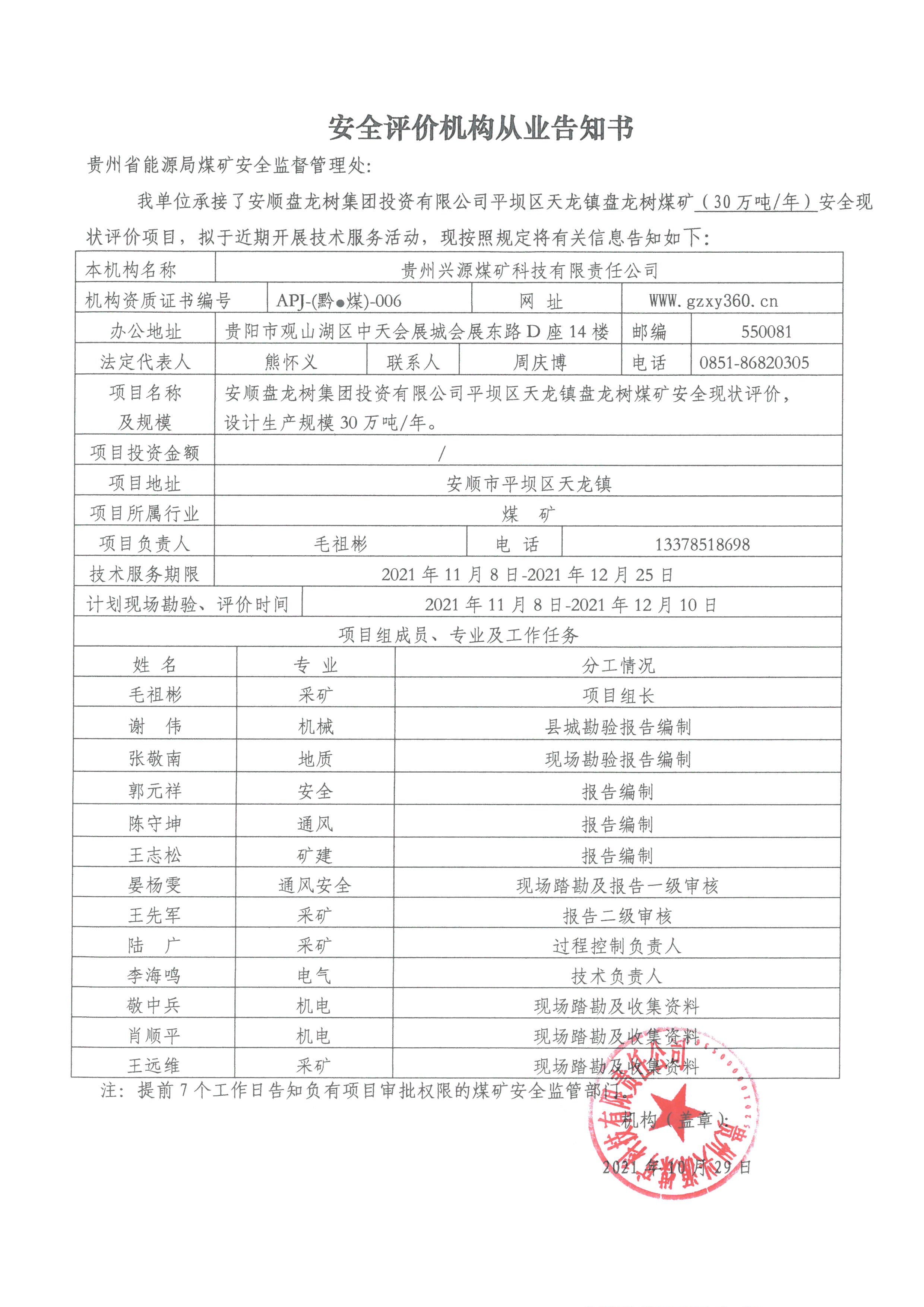 安全評價機構從業告知書(安順盤龍樹集團投資有限公司平壩區天龍鎮盤龍樹煤礦(30萬噸/年)安全現狀評價)
