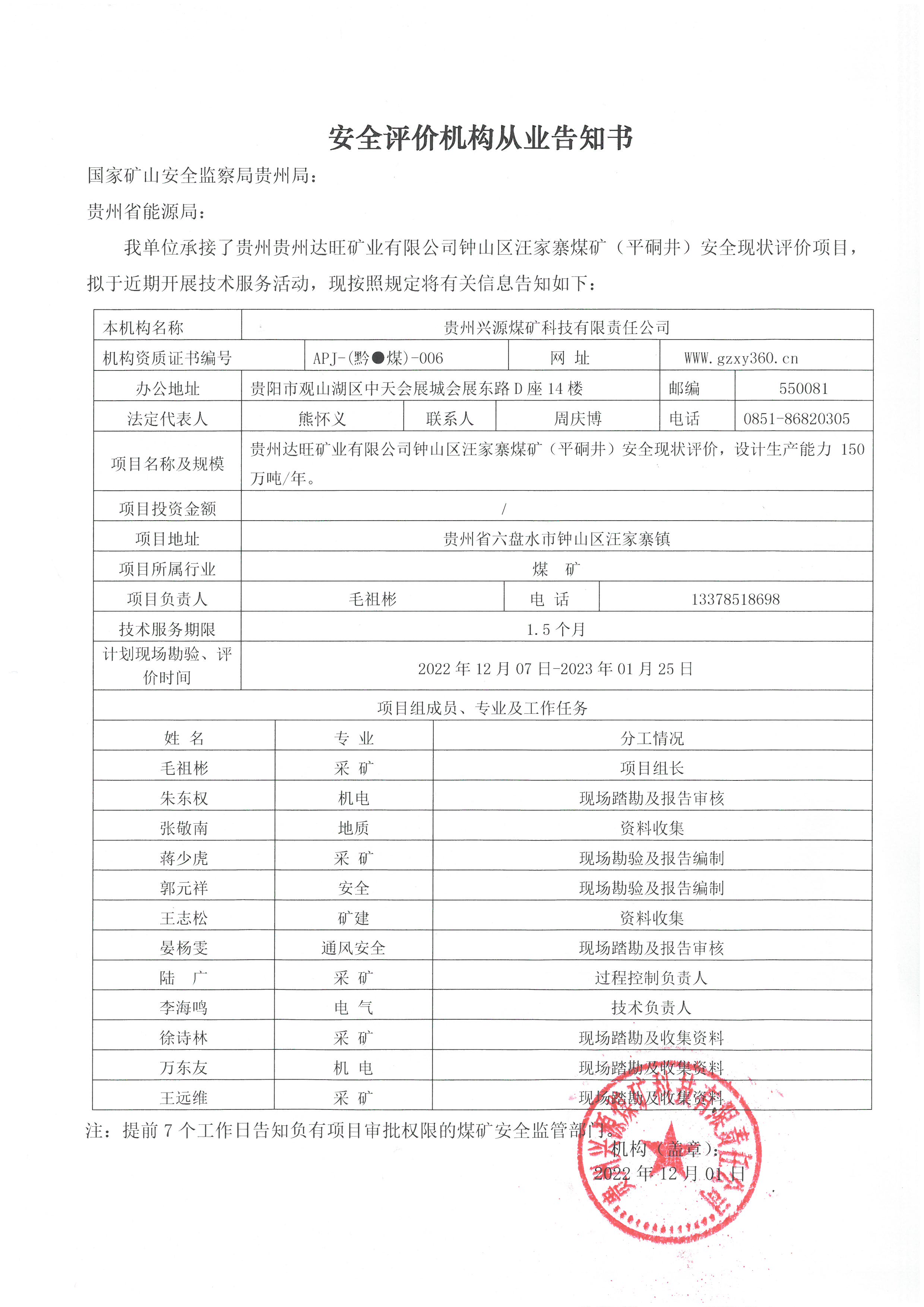 安全評價機構從業告知書【貴州貴州達旺礦業有限公司鐘山區汪家寨煤礦(平硐井)安全現狀評價項目】