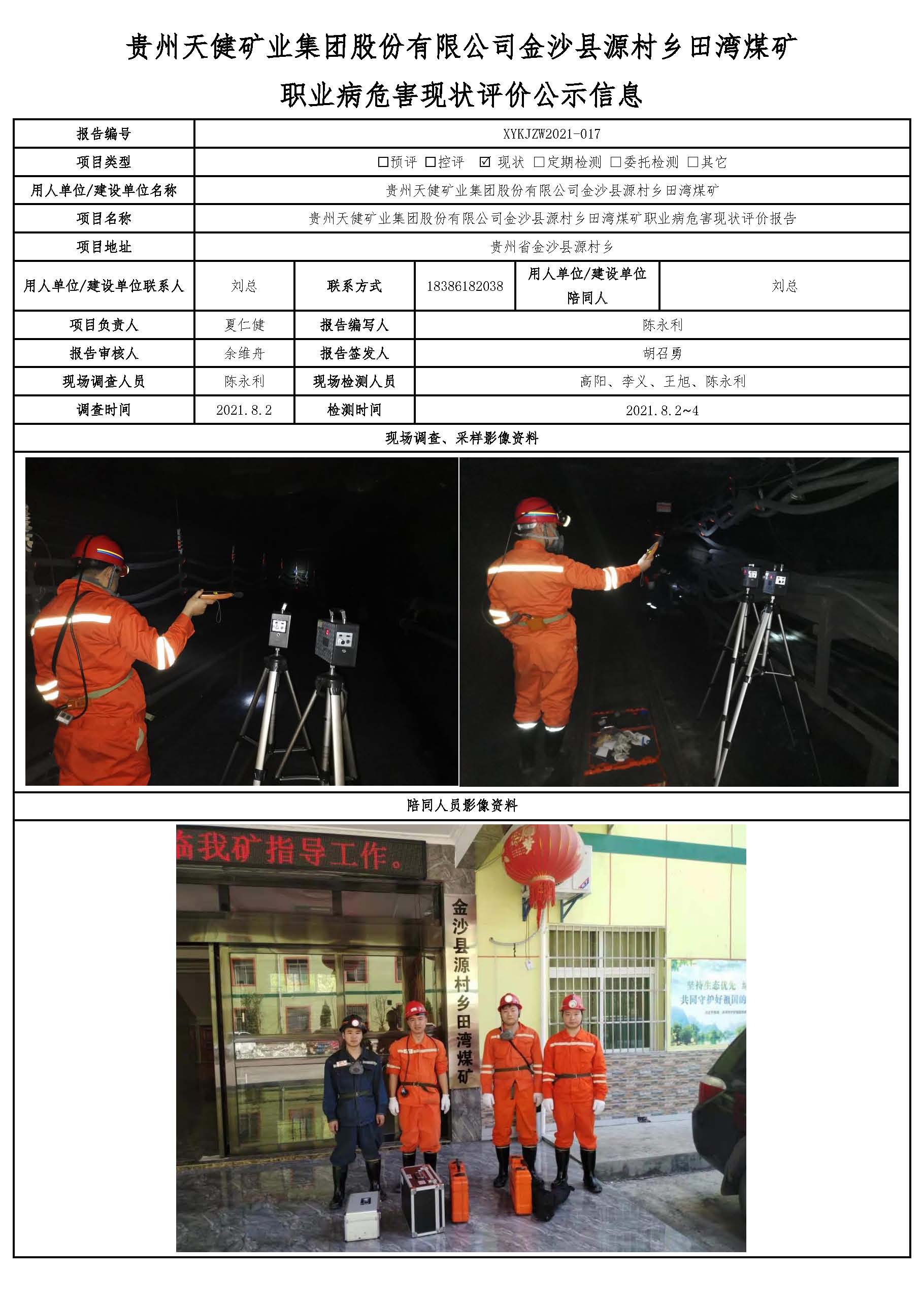 貴州天健礦業集團股份有限公司金沙縣源村鄉田灣煤礦 職業病危害現狀評價公示信息