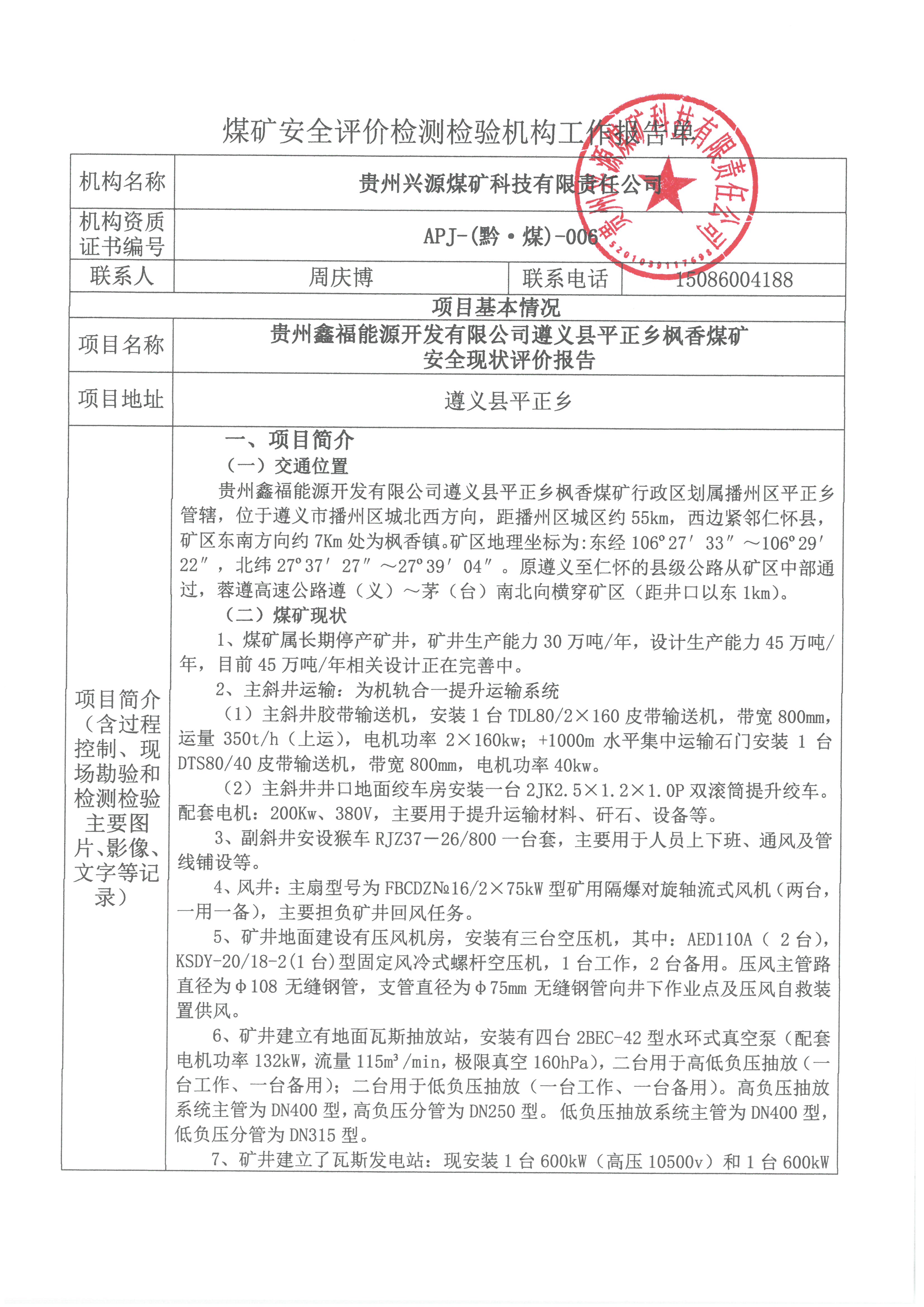 煤礦安全評價檢測檢驗機構工作報告單【貴州鑫福能源開發有限公司遵義縣平正鄉楓香煤礦】安全現狀評價報告