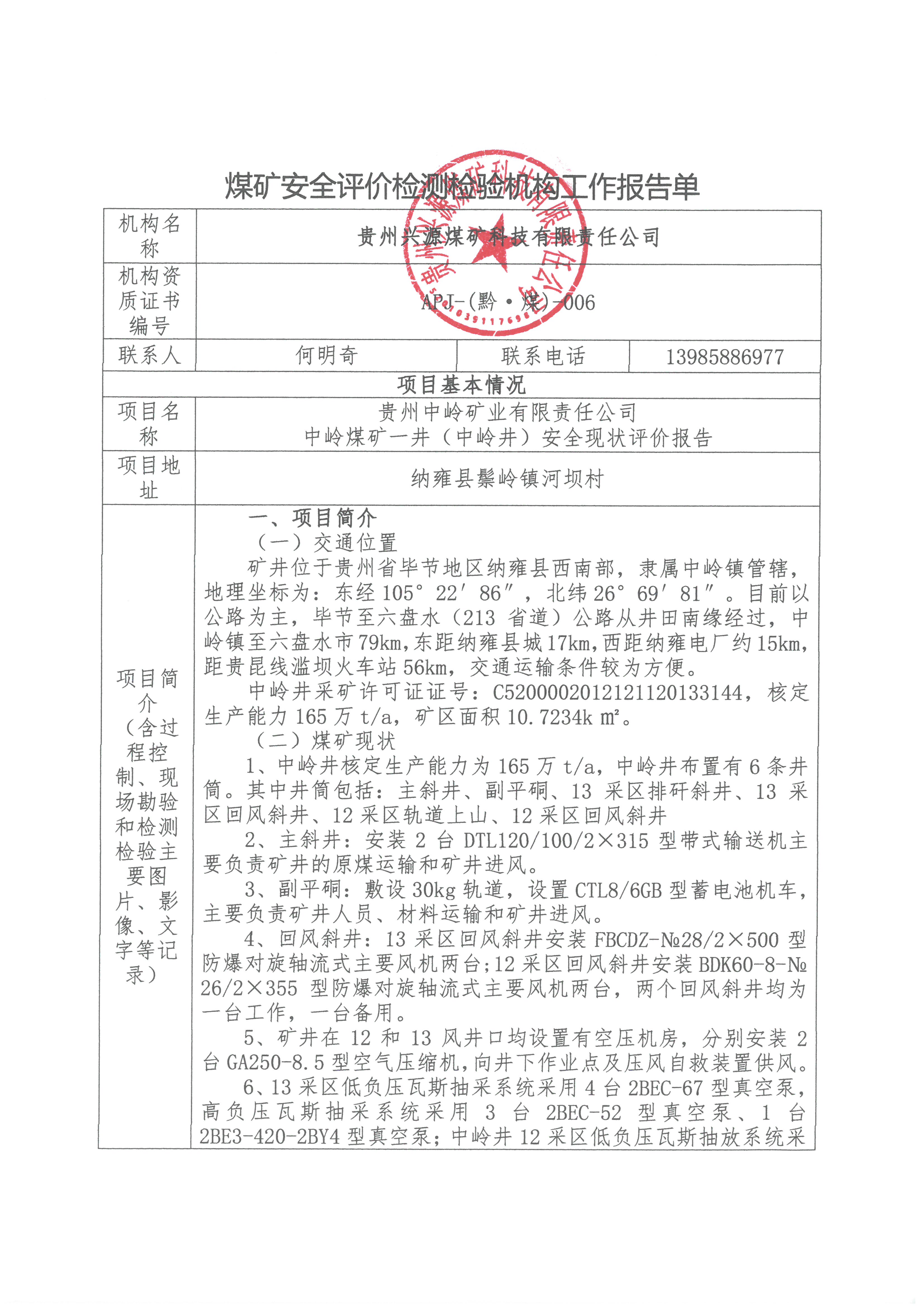 煤礦安全評價檢測檢驗機構工作報告單【貴州中嶺礦業有限責任公司中嶺煤礦一井(中嶺井)安全現狀評價報告】