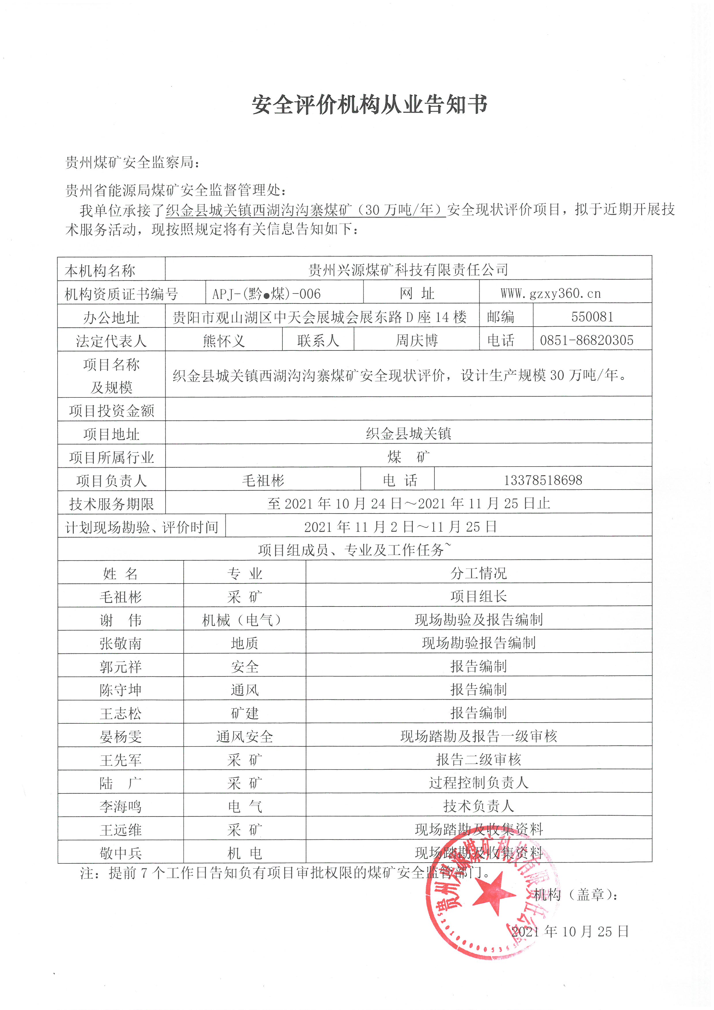 安全評價機(jī)構(gòu)從業(yè)告知書(織金縣城關(guān)鎮(zhèn)西湖溝溝寨煤礦(30萬噸/年)安全現(xiàn)狀評價)