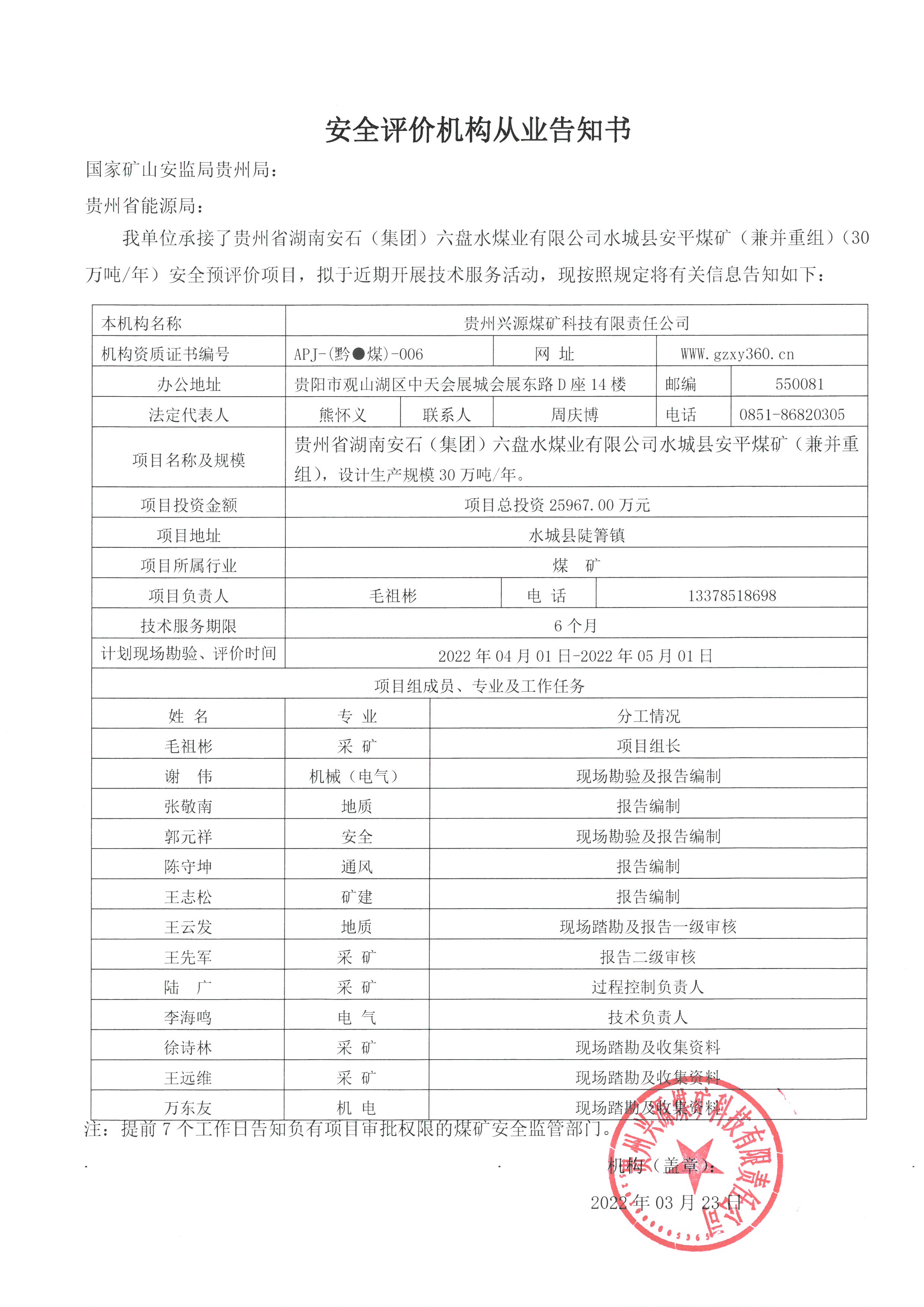 安全評價機構從業告知書【貴州省湖南安石(集團)六盤水煤業有限公司水城縣安平煤礦(兼并重組)(30萬噸/年)安全預評價】