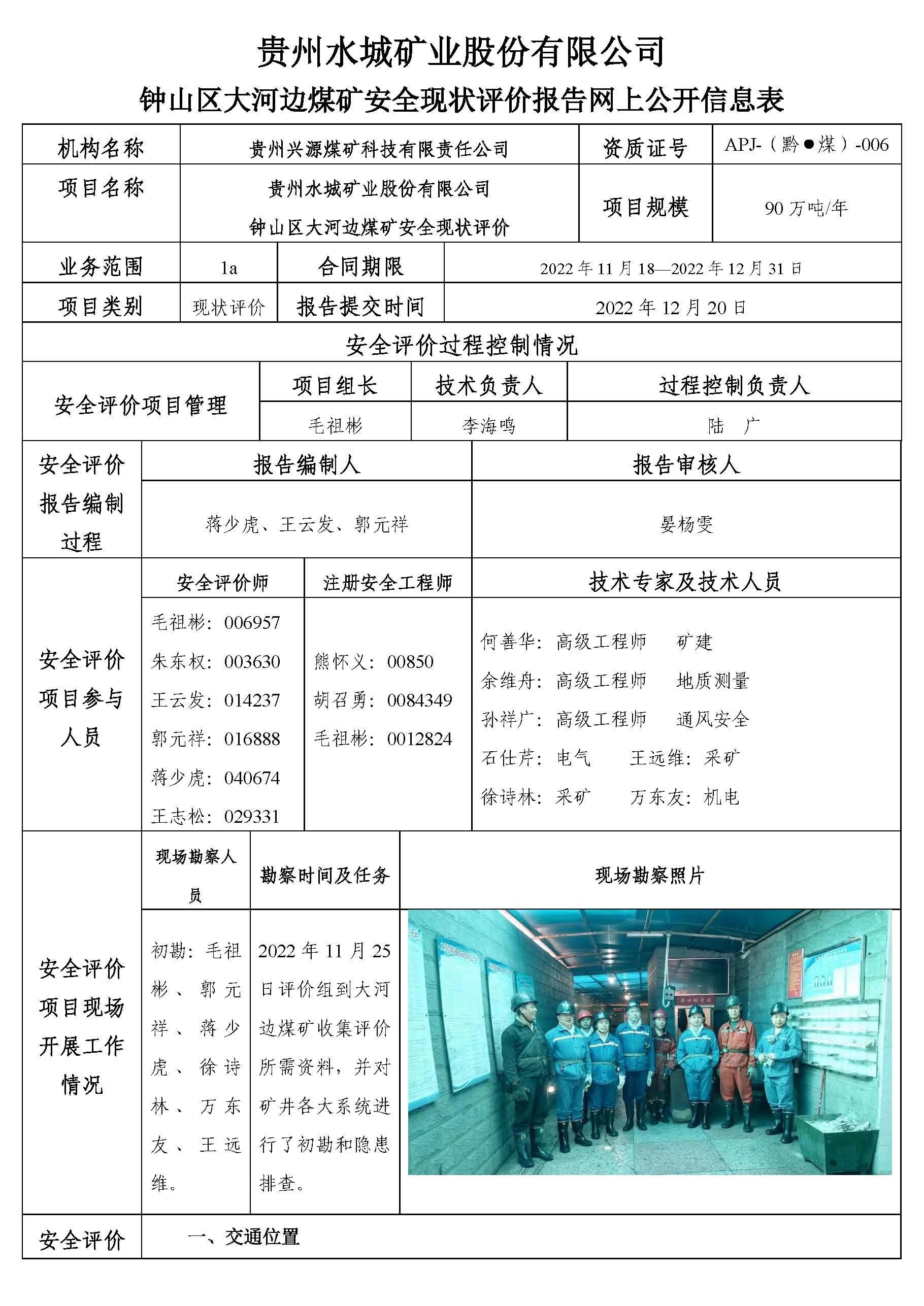 貴州水城礦業股份有限公司 鐘山區大河邊煤礦安全現狀評價報告網上公開信息表