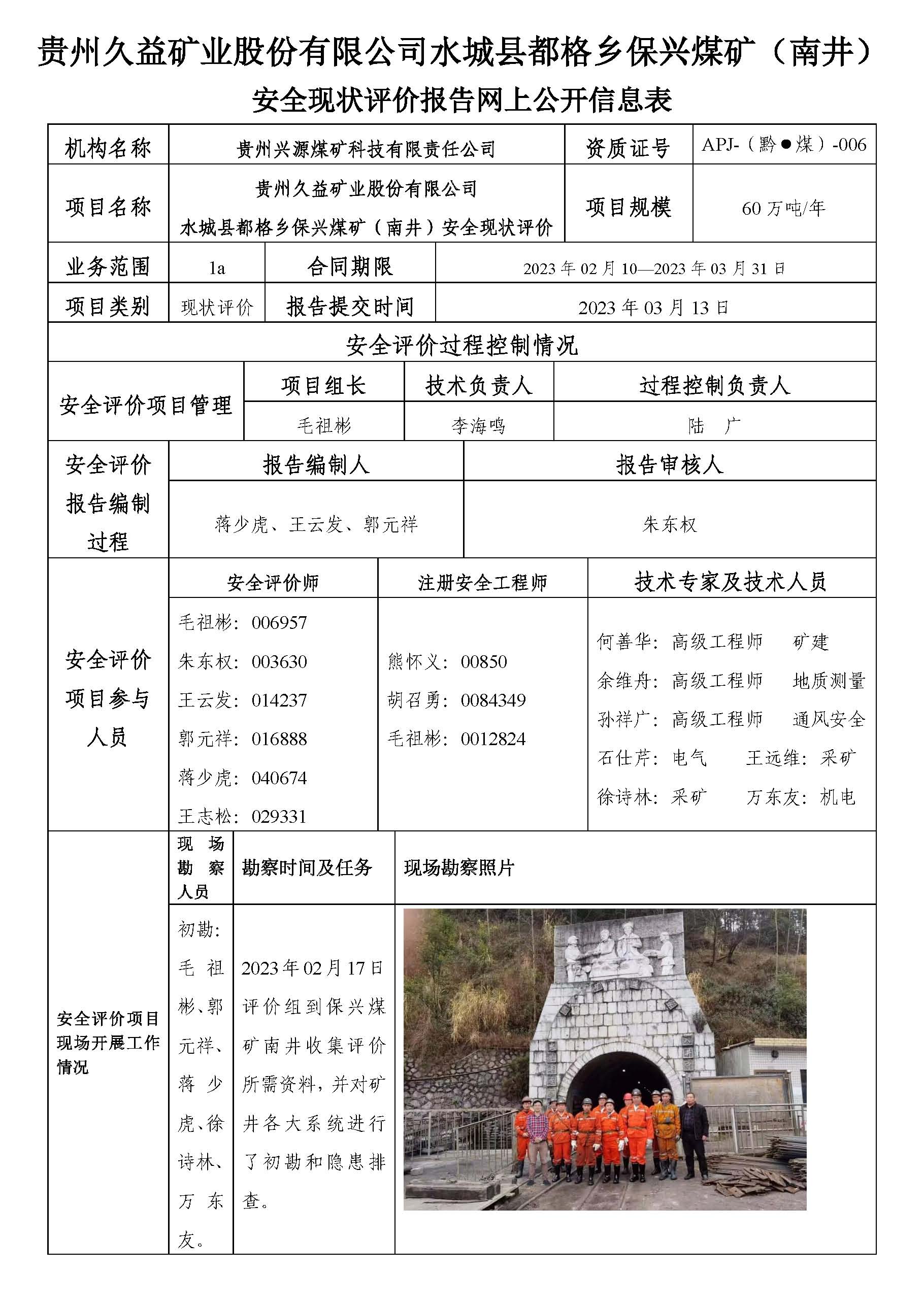 貴州久益礦業股份有限公司水城縣都格鄉保興煤礦(南井)安全現狀評價報告網上公開信息表