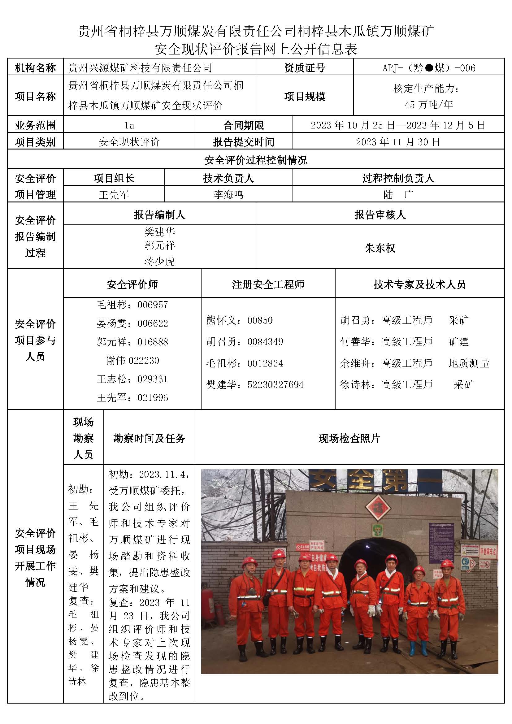 貴州省桐梓縣萬順煤炭有限責任公司桐梓縣木瓜鎮萬順煤礦安全現狀評價報告網上公開信息表