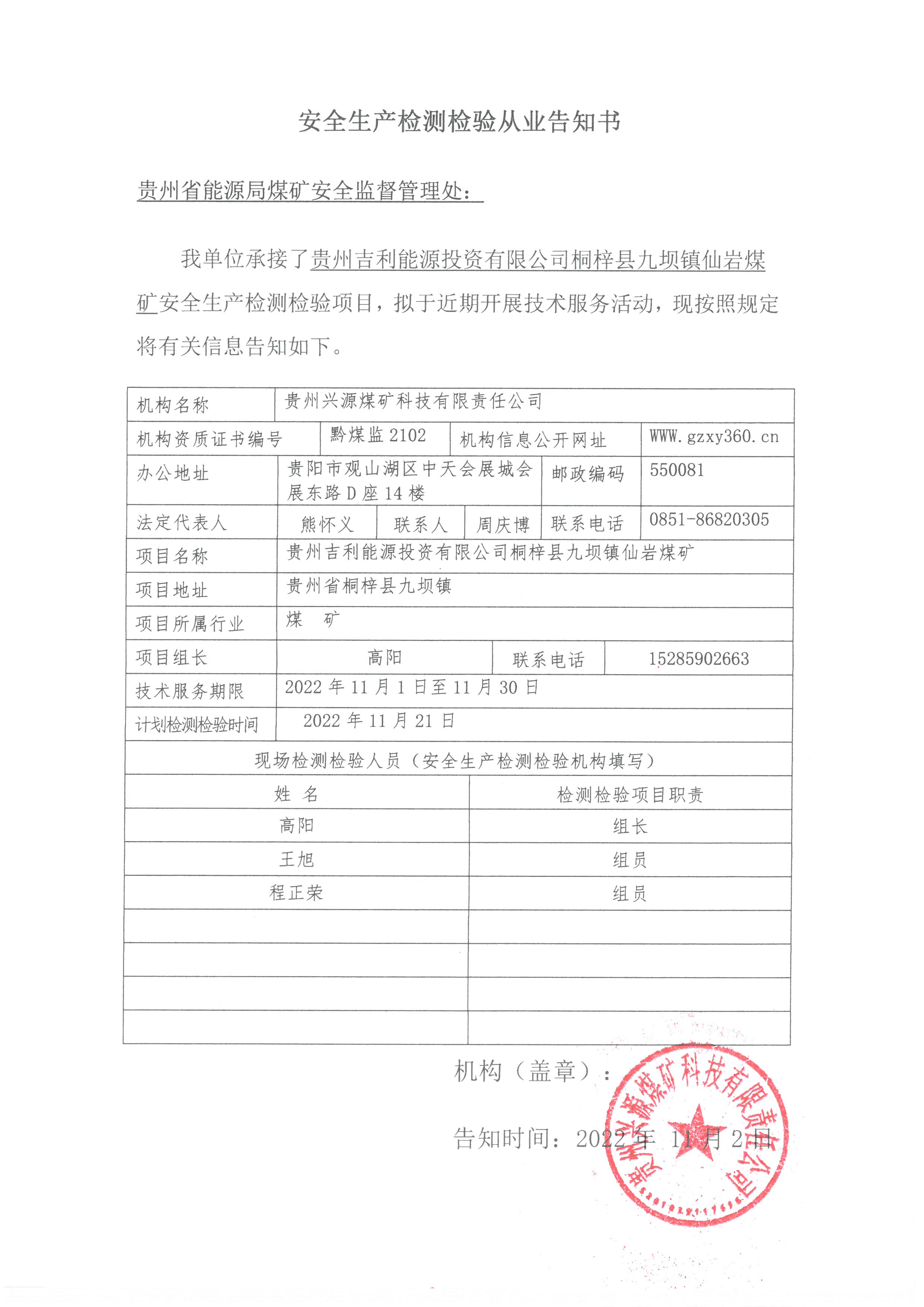 安全生產檢測檢驗從業告知書【貴州吉利能源投資有限公司桐梓縣九壩鎮仙巖煤礦】