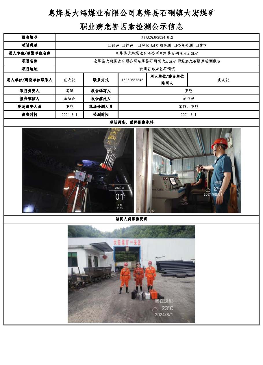 息烽縣大鴻煤業(yè)有限公司息烽縣石硐鎮(zhèn)大宏煤礦職業(yè)病危害因素檢測公示信息