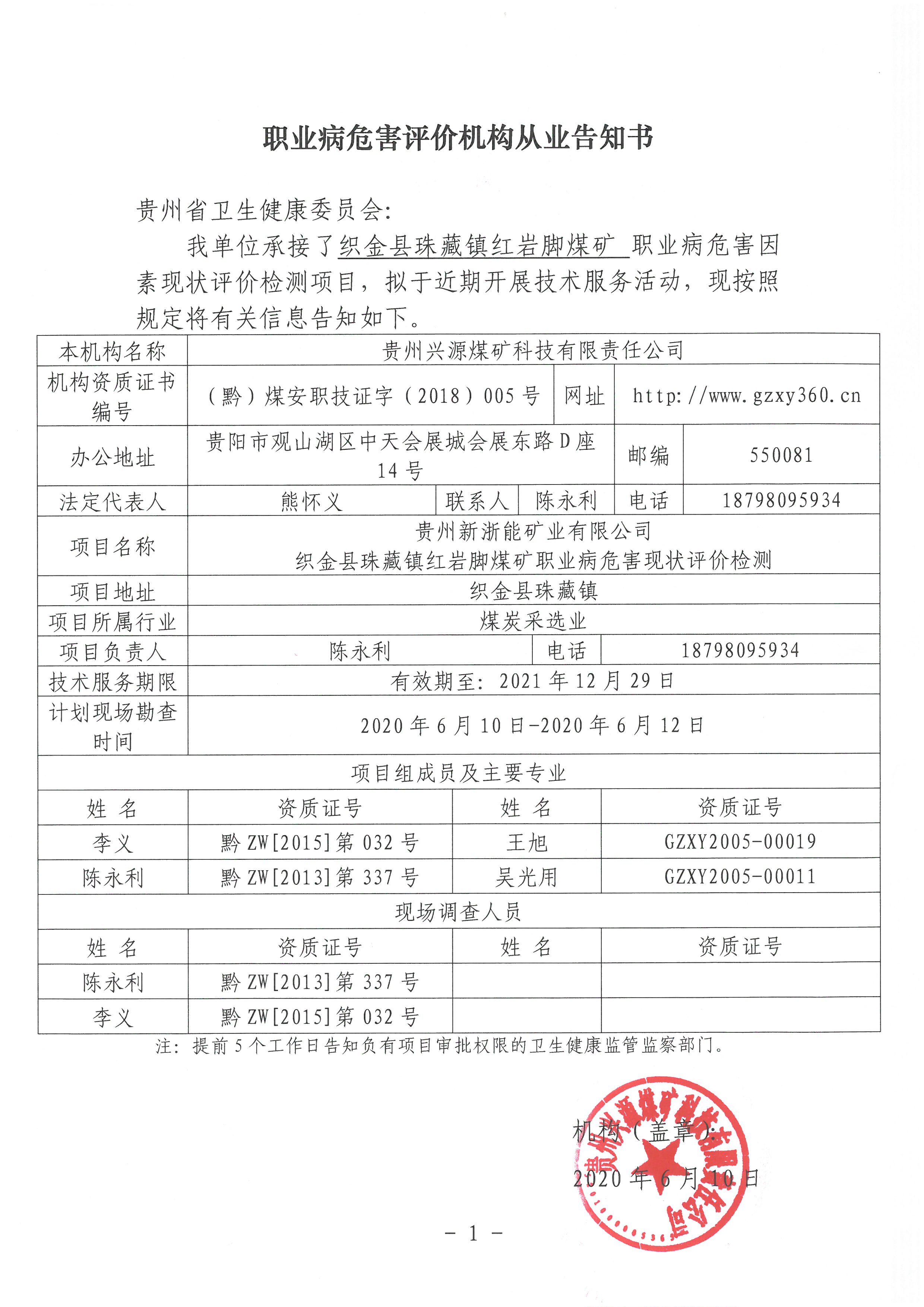 職業(yè)病危害評價機(jī)構(gòu)從業(yè)告知書[織金縣珠藏鎮(zhèn)紅巖腳煤礦]